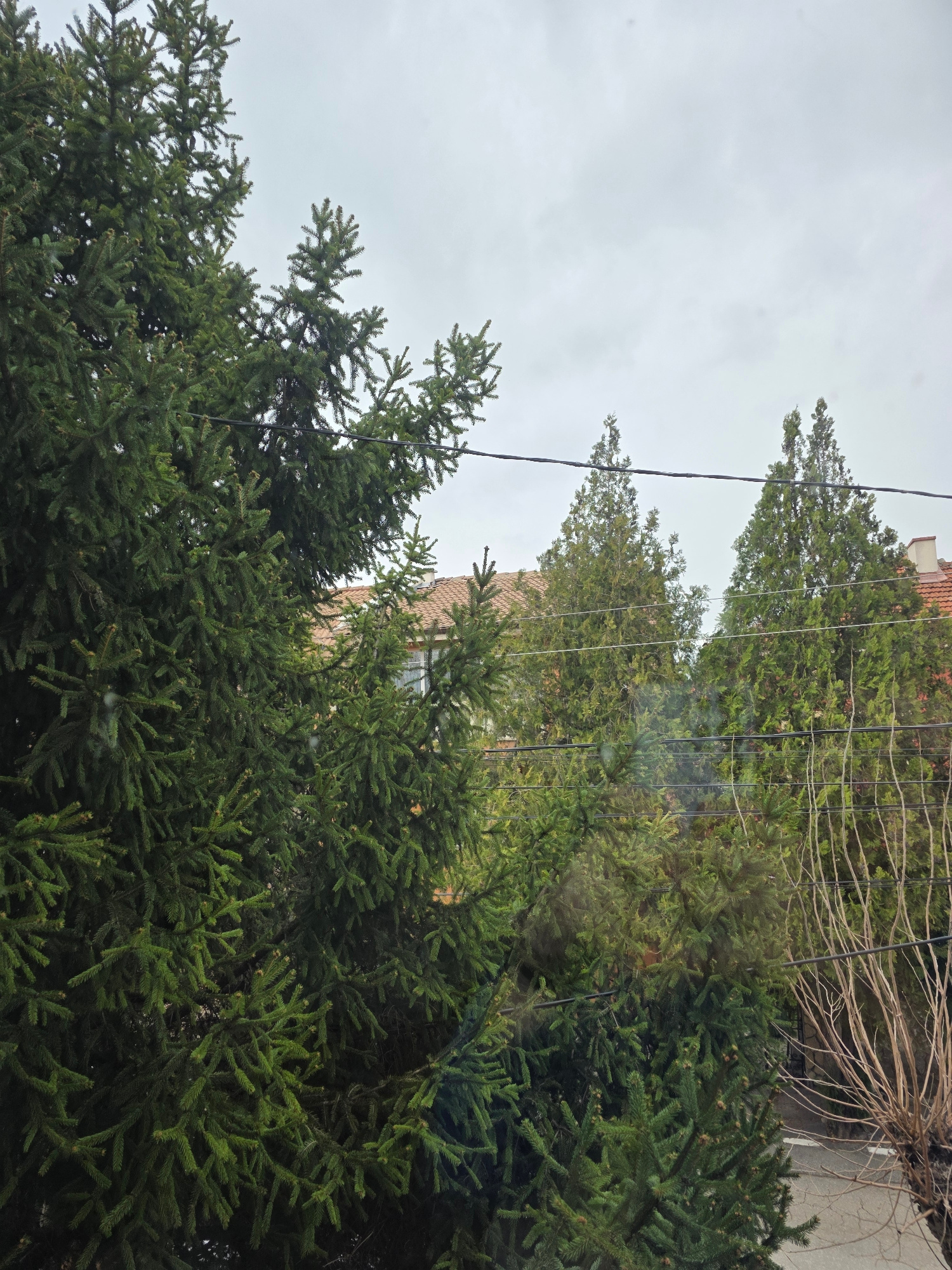 The image, possibly taken through a window, shows a view of green coniferous trees with parts of a building behind them. The building appears to be made of brick with a red tile roof and at least one…read more