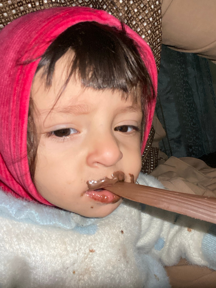 The scene is an indoor setting in Kandahar, Afghanistan. A young child is depicted in a close-up, chest-up shot. The child has dark hair with bangs visible below a magenta-colored head covering that f…read more