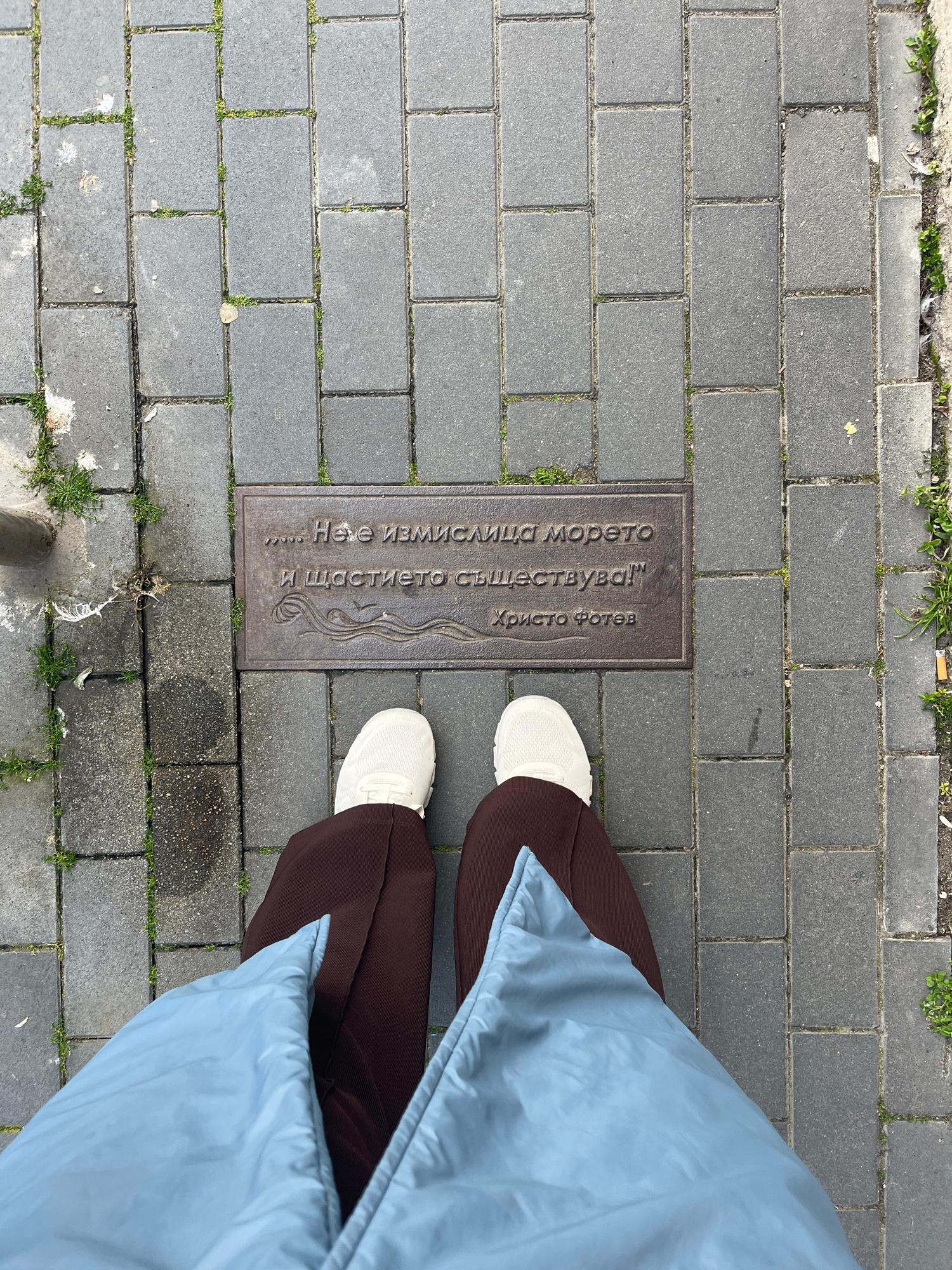 An overhead shot captures a person's lower body standing on a paved outdoor surface in Burgas, Bulgaria. The person is wearing dark brown trousers, white sneakers, and a light blue puffy jacket or coa…read more