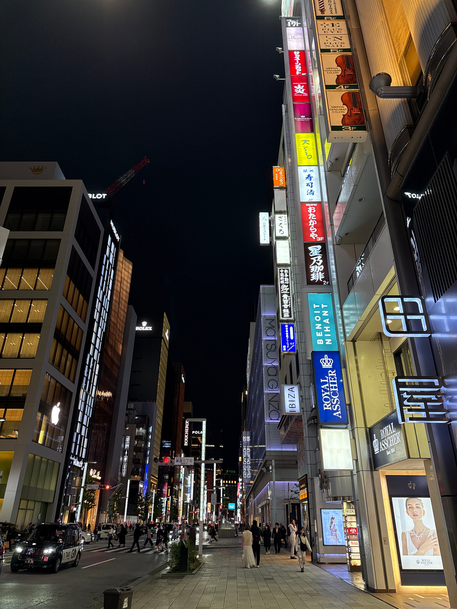 The image captures a vibrant city street scene at night, likely in the Ginza district of Chuo, Japan. The dark sky is illuminated by a multitude of artificial lights emanating from buildings, streetli…read more