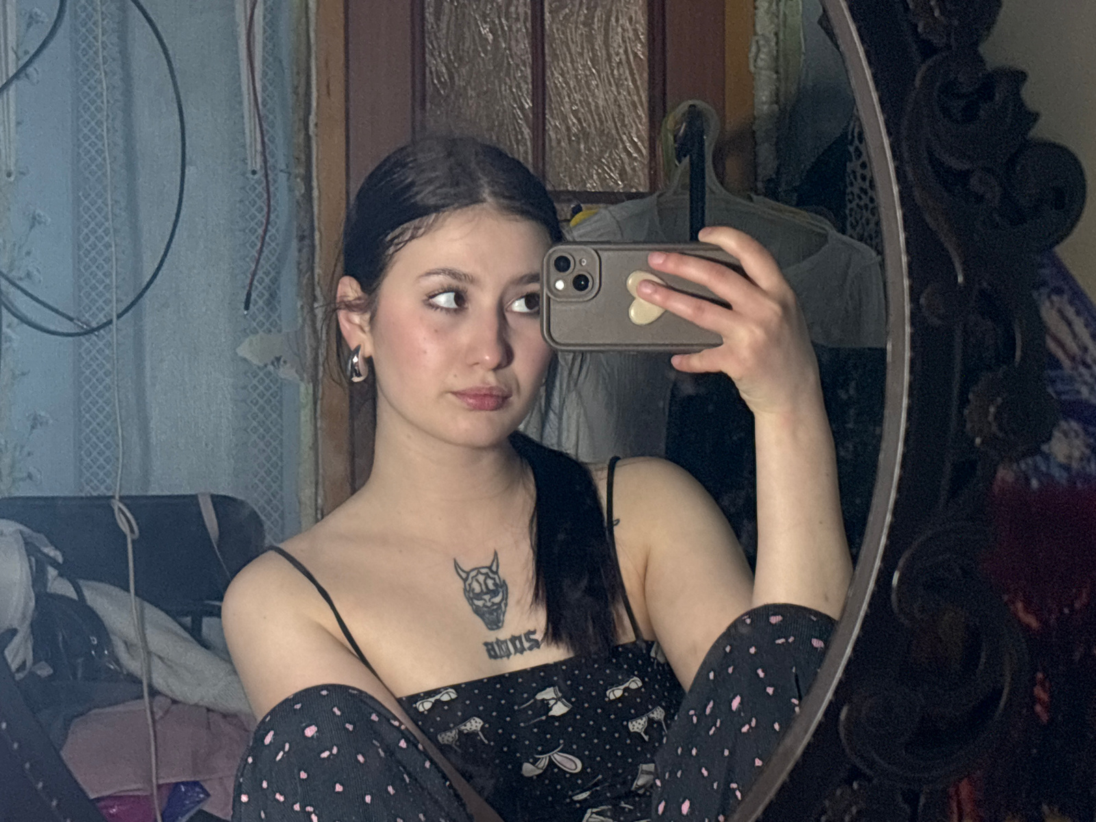 A young woman with dark hair, parted in the middle and pulled back, is taking a selfie in a mirror. She has light skin, dark eyes, and a tattoo on her chest depicting a stylized skull above text. She…read more