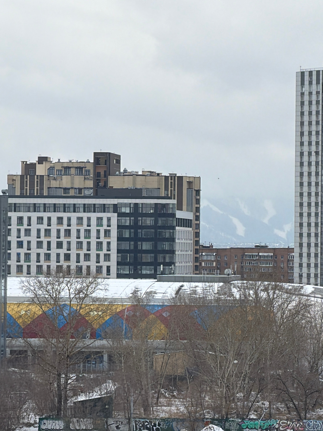 The image, oriented upright, depicts a winter or early spring urban scene in Krasnoyarsk, Russia, under an overcast sky. The landscape features a mix of modern and older multi-story buildings and bare…read more