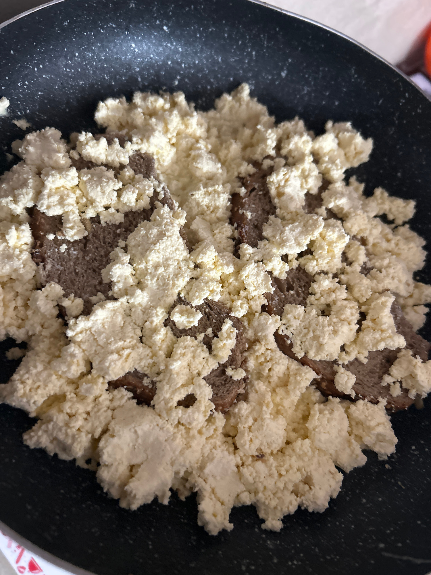 The image provides a close-up, top-down view of food being prepared in a dark cooking pan, likely a frying pan. The main subjects are two distinct food items. A base layer of dark brown, possibly redd…read more