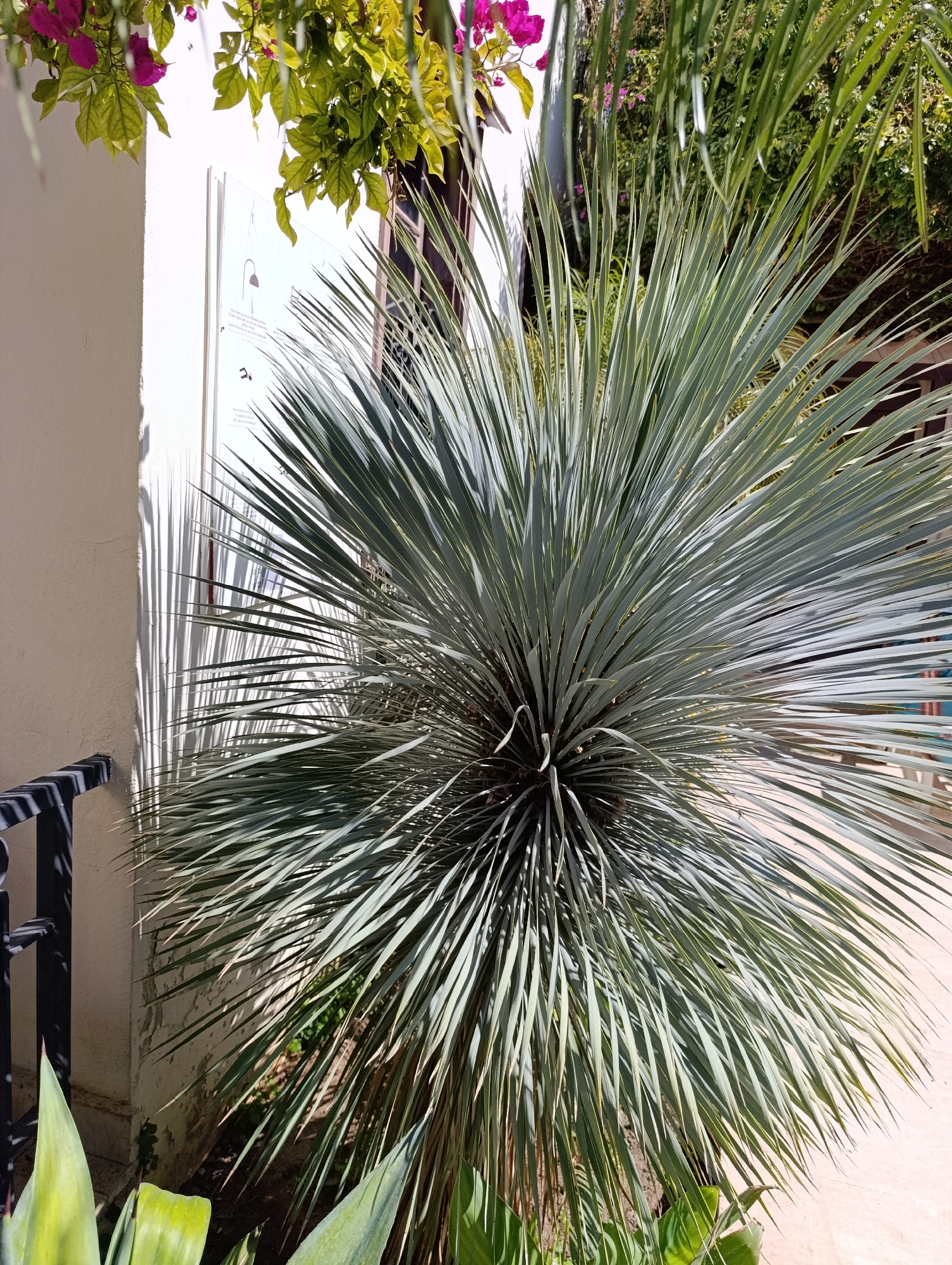 The image shows a plant, specifically a Yucca rostrata or Beaked Yucca, growing near a white wall. There are also some other plants with broad green leaves at the base of the Yucca. Additionally, ther…read more