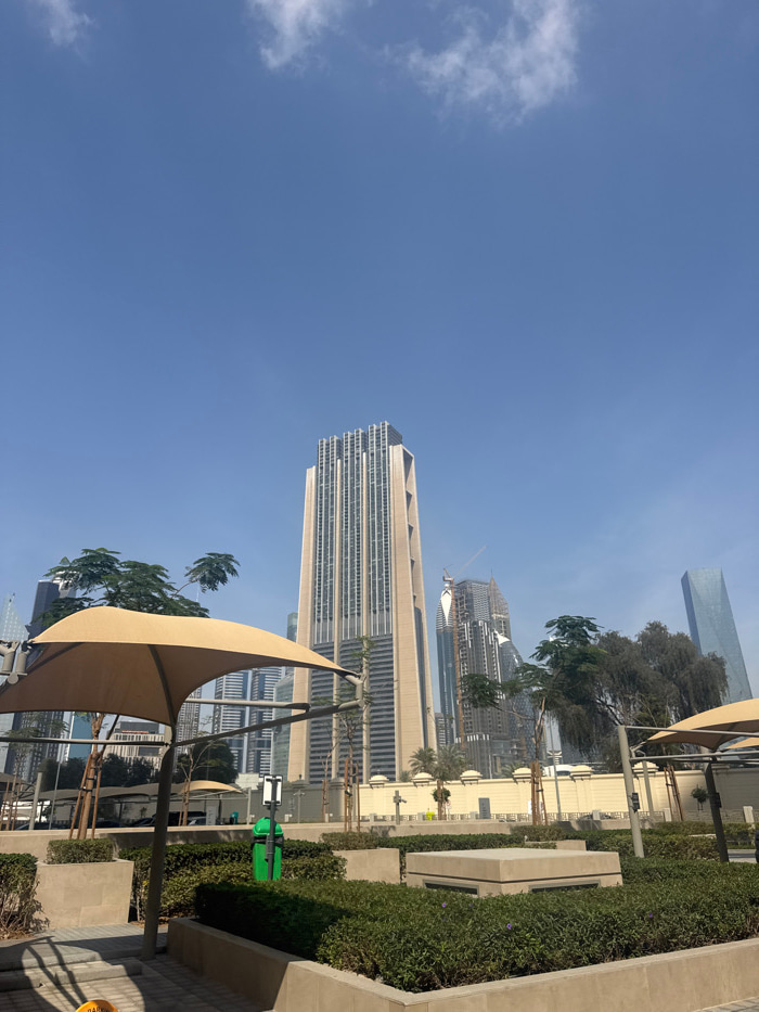 A view from a landscaped area featuring trimmed bushes and concrete structures. Tall, modern buildings dominate the skyline against a clear blue sky with scattered clouds. A tan-colored awning provide…read more
