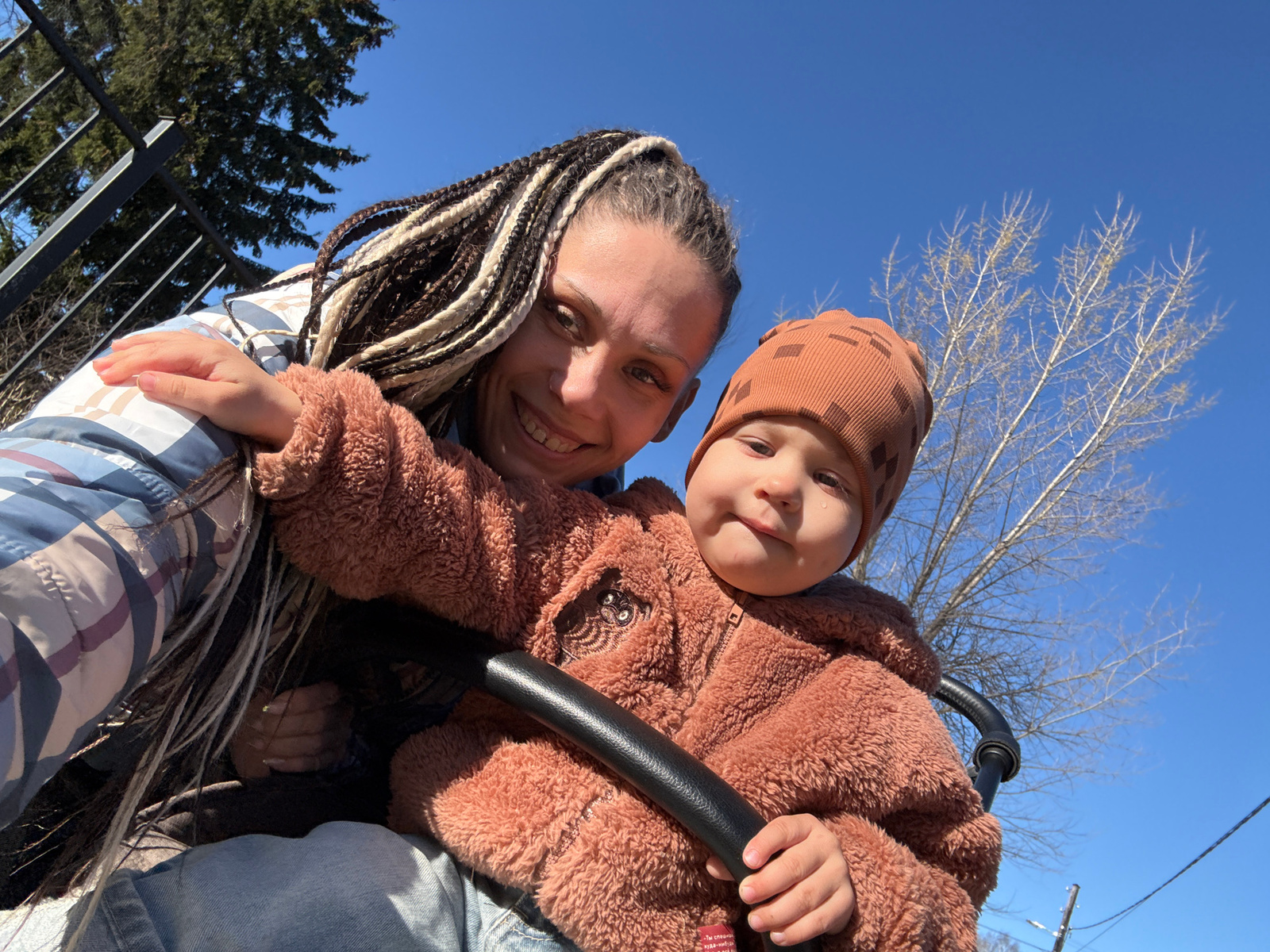 An overhead shot captures an adult and a young child looking down towards the camera from a low angle, set against a bright, clear blue sky. The adult, positioned on the right, has dark and light braiβ¦read more
