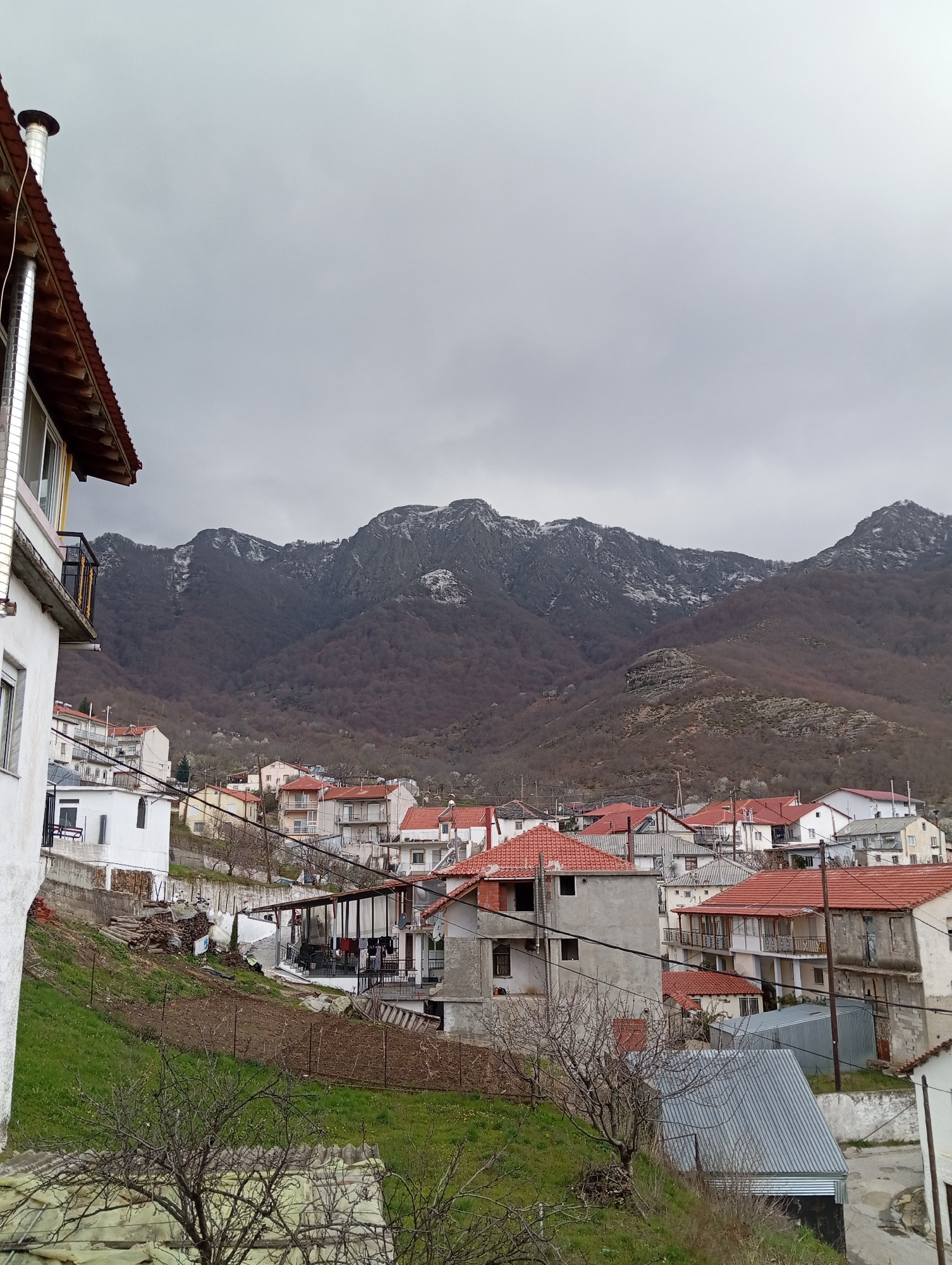 The image depicts a village nestled in a mountainous region, likely Δημάρι, Greece. The sky is overcast. Mountains rise in the background with some snow visible on their peaks. The village consists of…read more