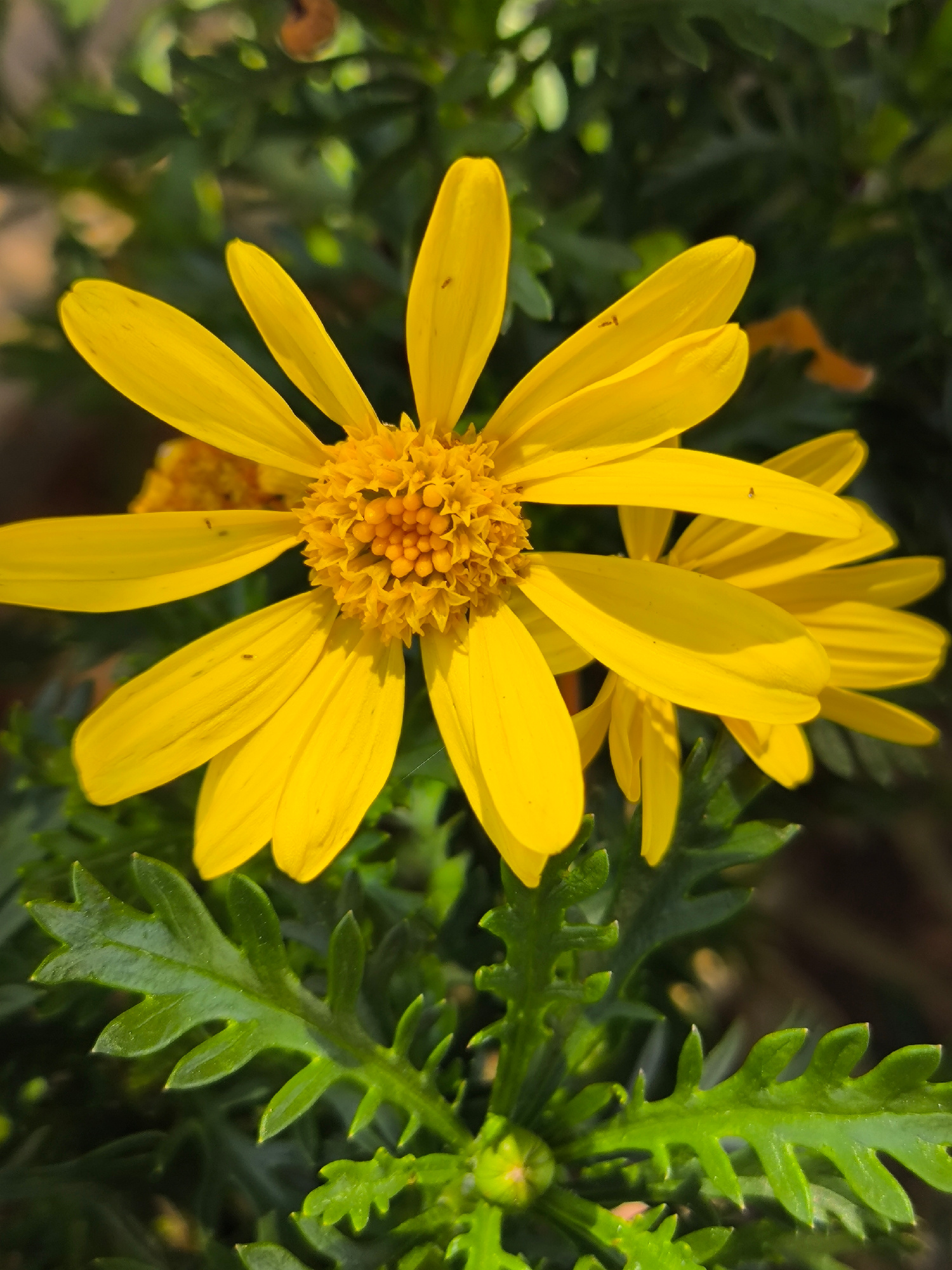A close-up shot captures a vibrant yellow flower with multiple petals surrounding a tightly packed, orange center. The flower is partially obscuring another similar flower behind it. Surrounding the f…read more
