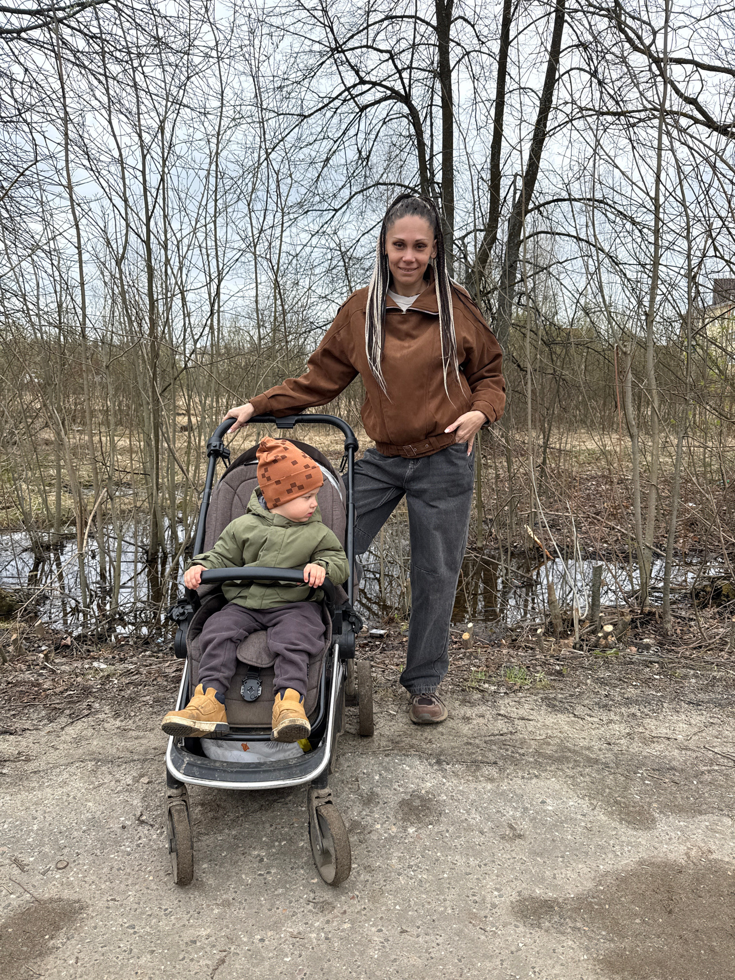 The image depicts an individual standing beside a stroller with a child inside, likely on a path in Rusanovo, Russia. The adult is wearing a brown jacket, dark pants, and brown shoes. They have long h…read more