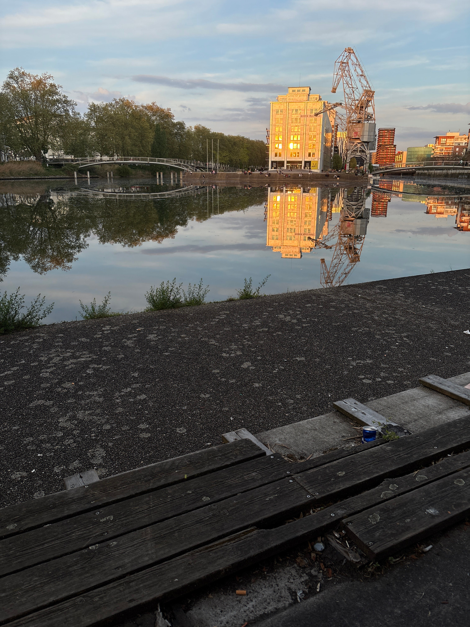 The image shows a scene in Strasbourg, France, reflected in water. Prominently featured is the André Malraux building, with a large crane extending above it. The reflection includes trees and a bridge…read more