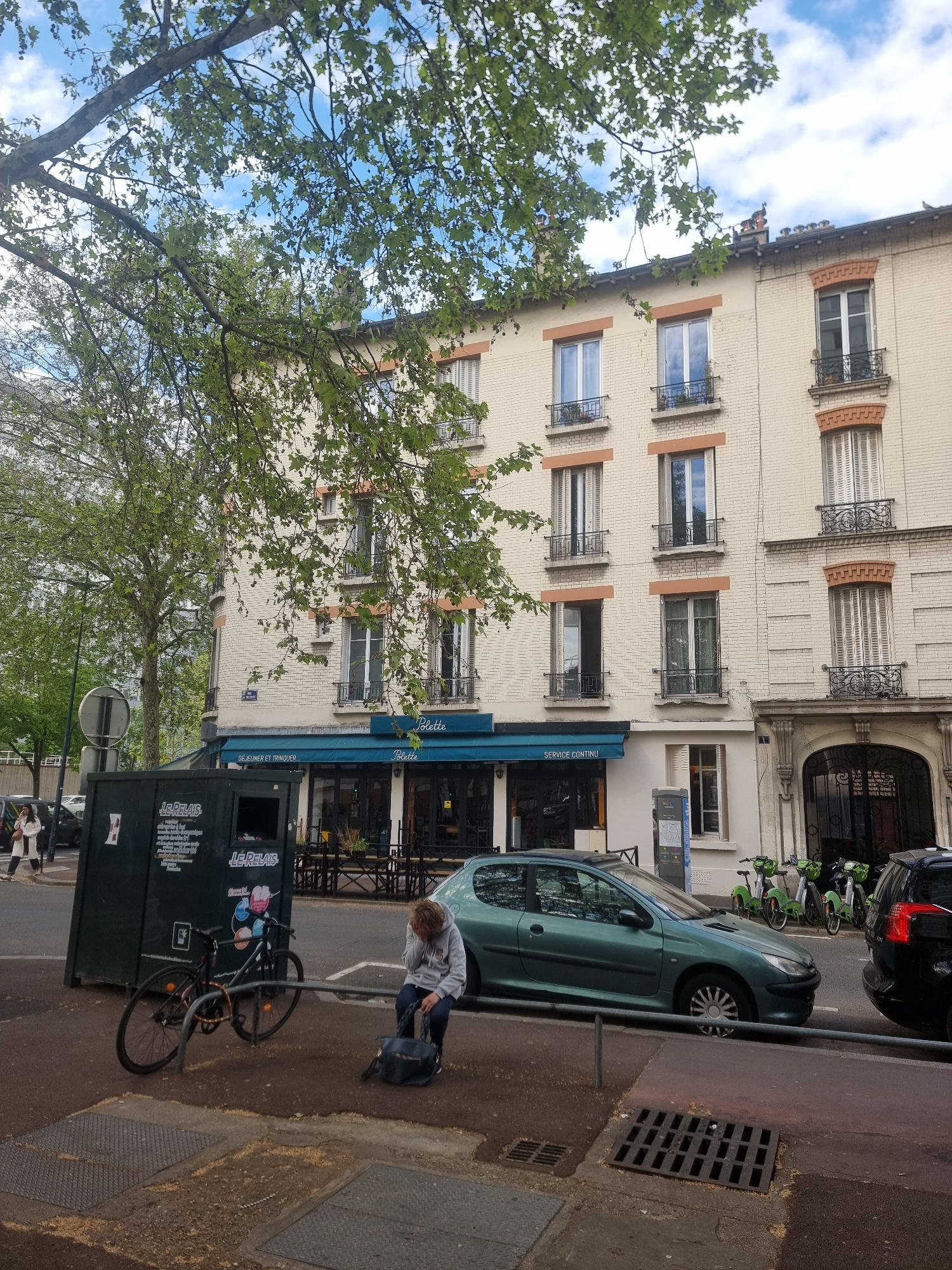 This image captures a street scene in Clichy, France, on what appears to be a bright, clear day with blue skies and scattered white clouds. The primary subject is a multi-story building, light beige iā¦read more