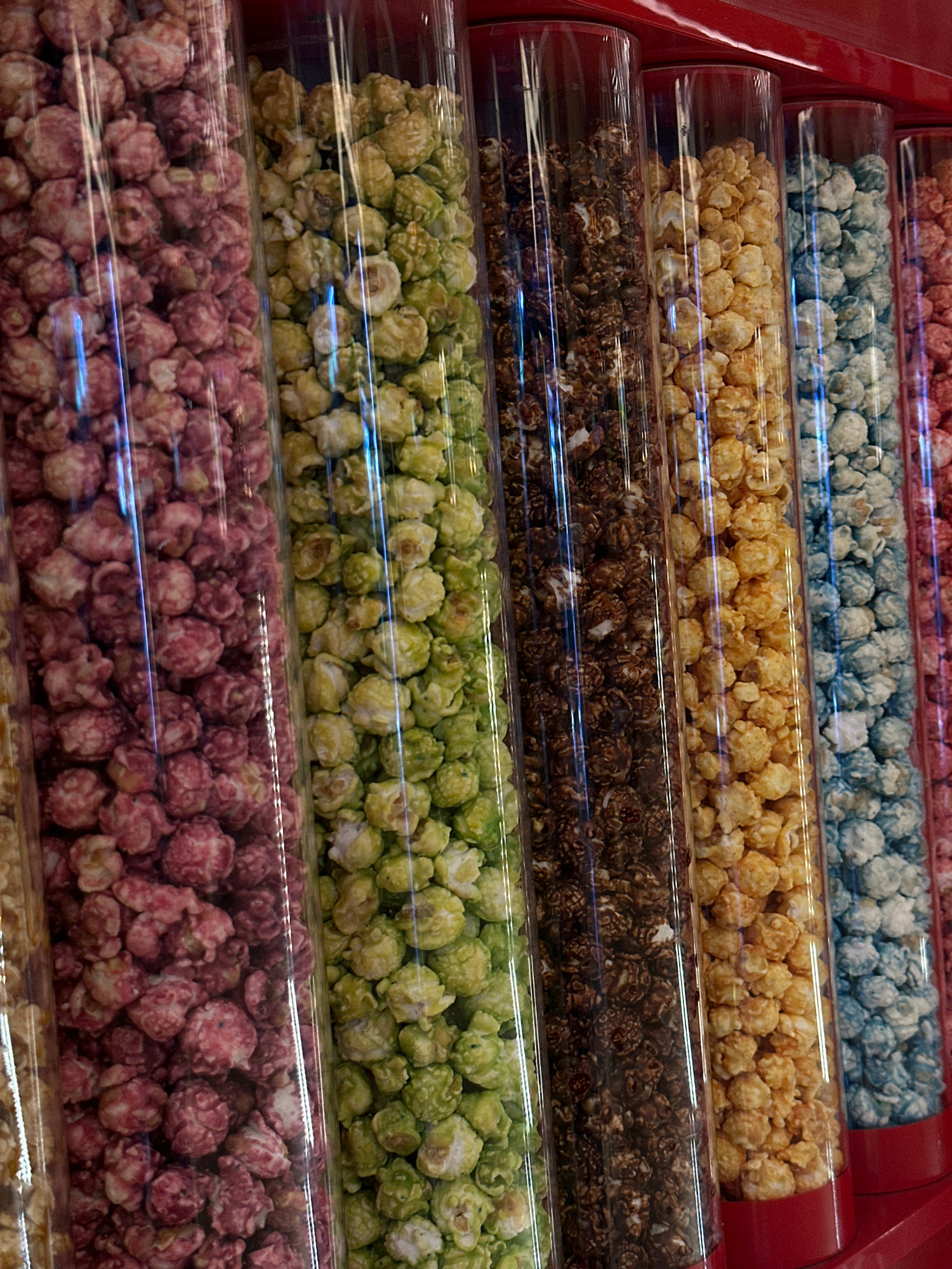 The image shows several rows of clear cylindrical containers filled with different colors and flavors of popcorn. From top to bottom, the flavors appear to be pink, blue, yellow/caramel, chocolate, gr…read more