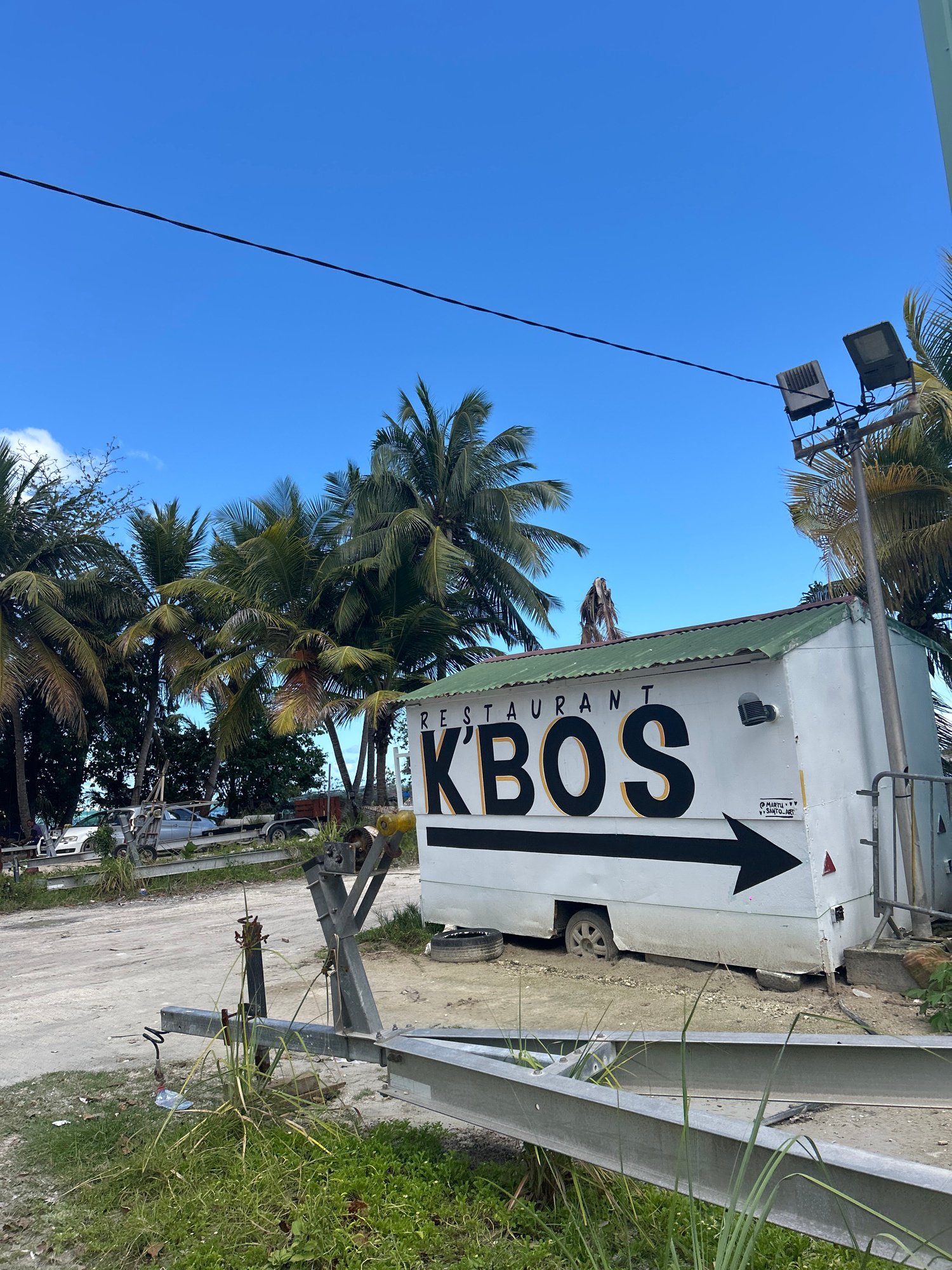 A daytime shot shows a white food trailer with the words "RESTAURANT KBOS" and a large black arrow pointing upwards. The trailer is parked on a sandy patch of ground adjacent to a grassy area and a me…read more