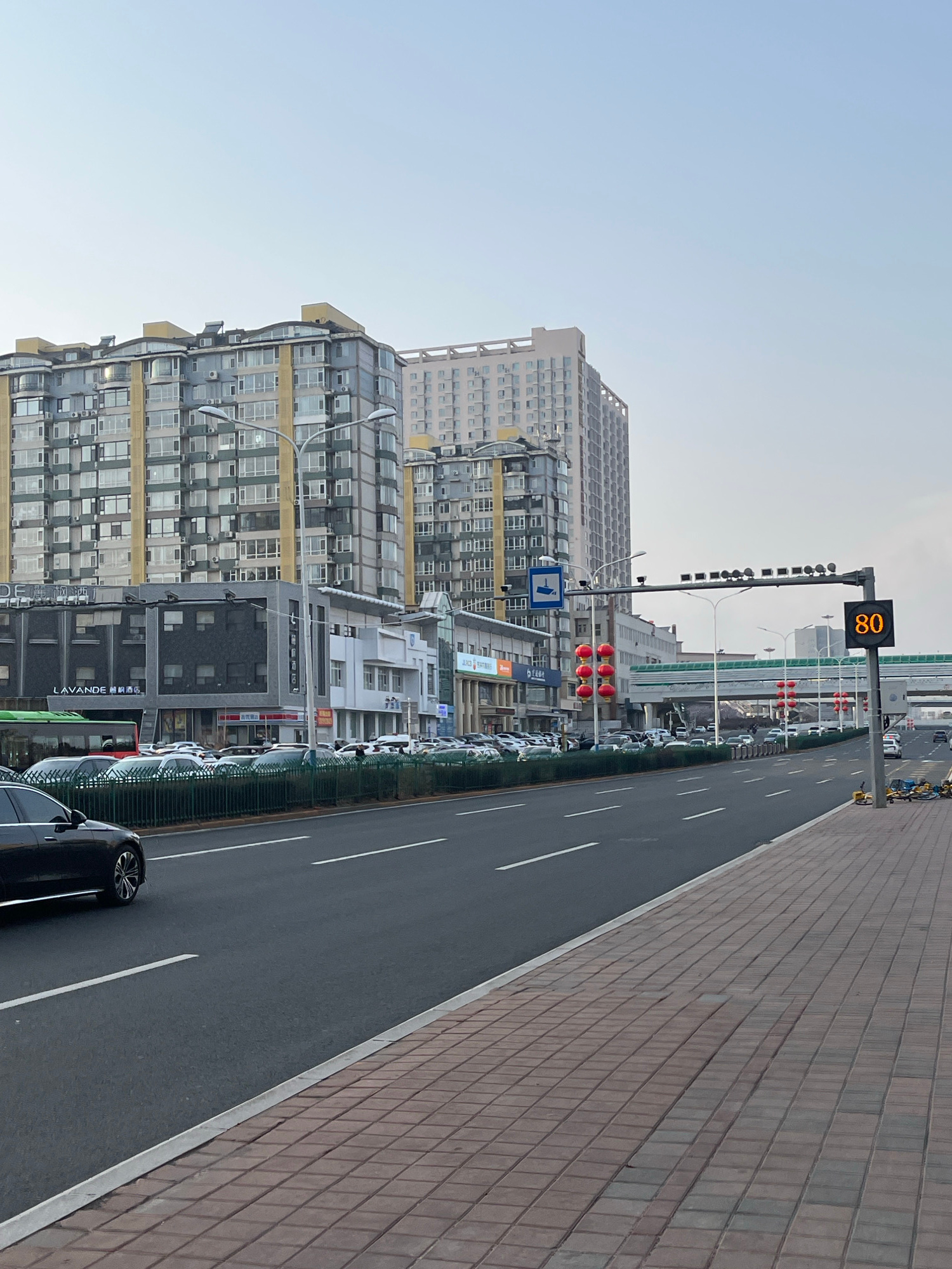 The image displays a clear daytime urban street scene in Changchun City, China. The perspective is from a slightly elevated point, looking down a multi-lane road that runs from the foreground into the…read more