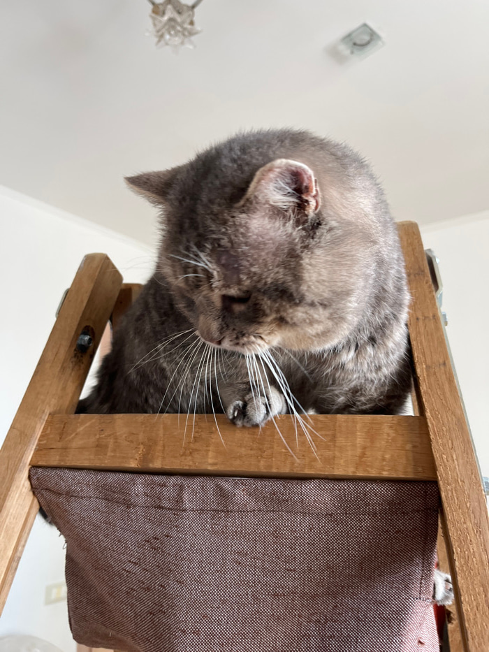 The image depicts an adult domestic cat positioned on an elevated wooden structure within an indoor setting. The cat, appearing to be a grey tabby with dense fur and prominent white whiskers, is orien…read more