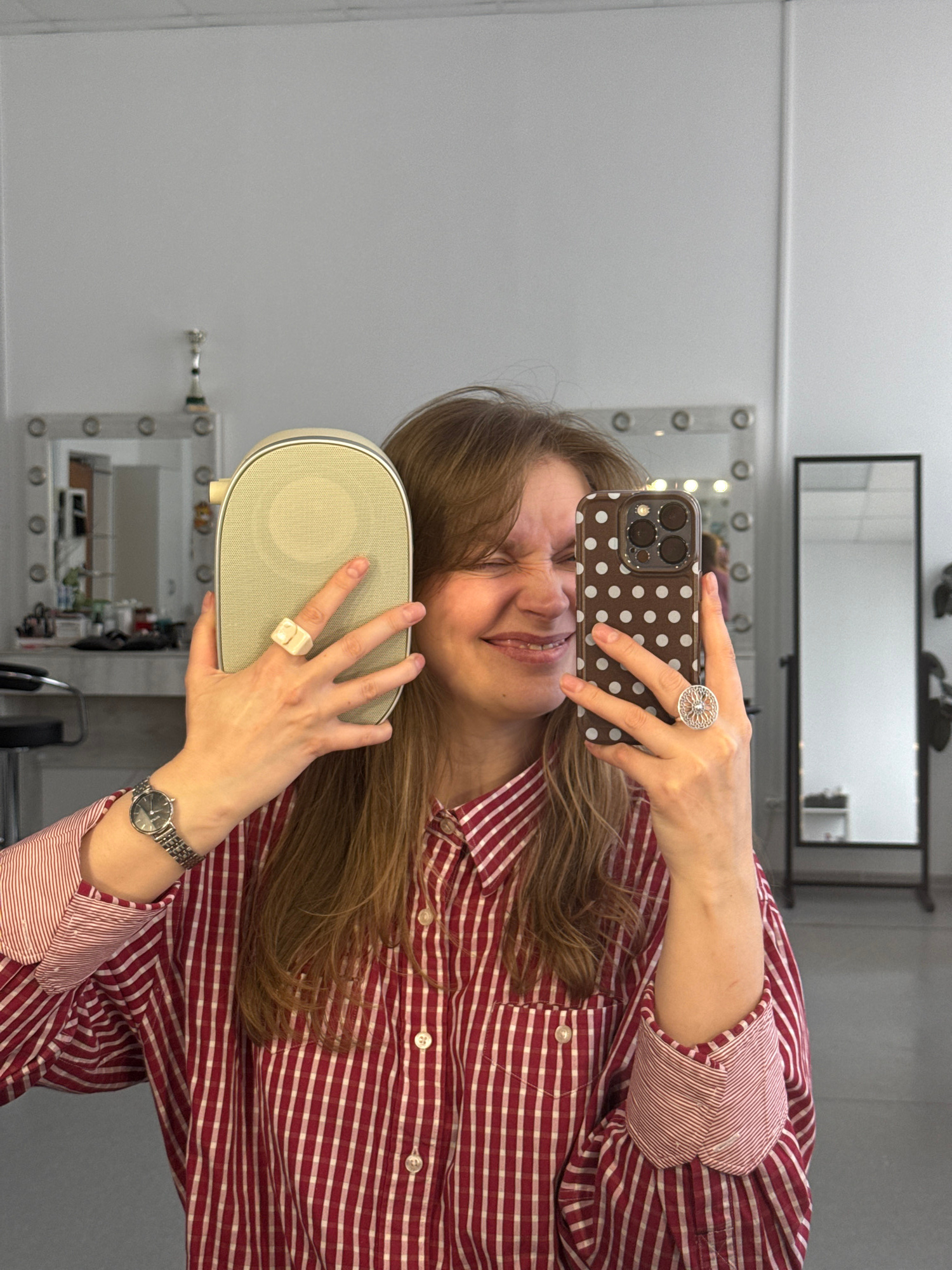 This sideways mirror selfie features a young woman smiling broadly, her eyes squinted in joyful amusement. She is positioned horizontally across the frame. The indoor setting, likely a dressing room o…read more