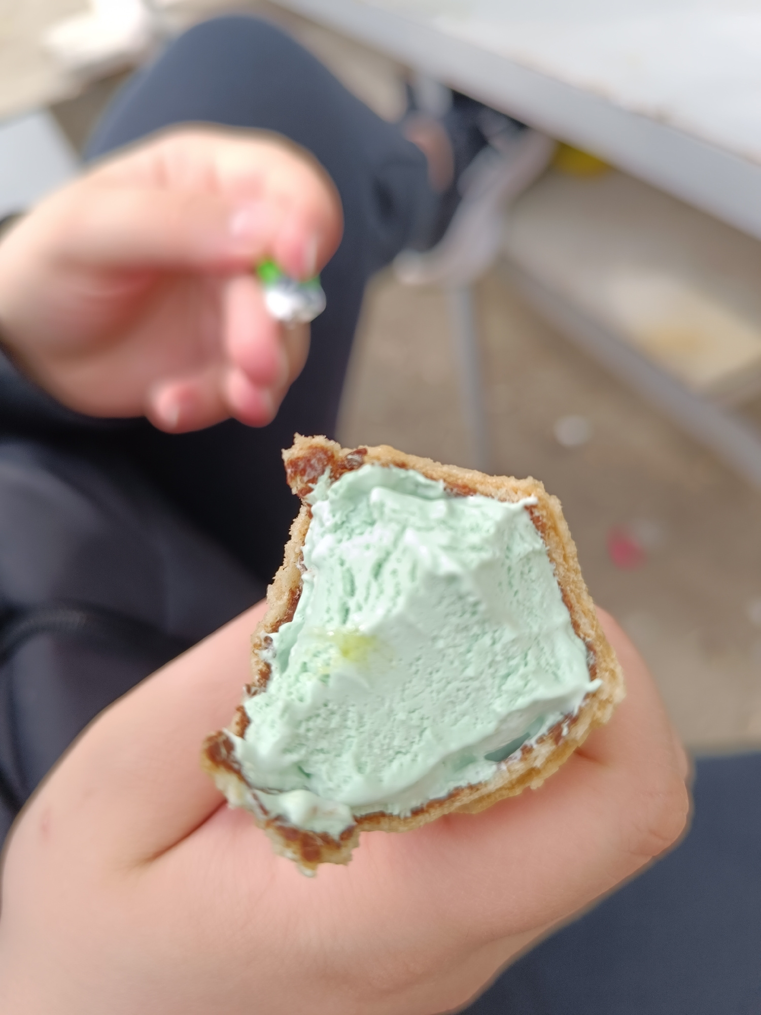 A person is holding a partially eaten green ice cream cone. The ice cream is in a waffle cone with a chocolate coating on the inside. Another person is holding a green and silver object in their hand.…read more