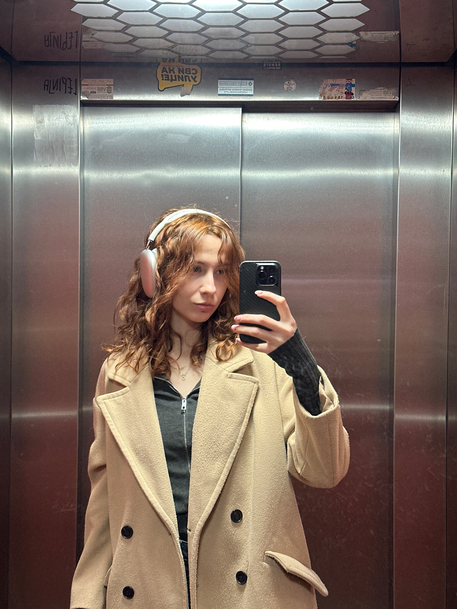 A woman is taking a selfie in an elevator. She is wearing a beige coat, a black top, and white headphones. Her hair is curly and red. She is holding a black smartphone. The elevator has stainless stee…read more