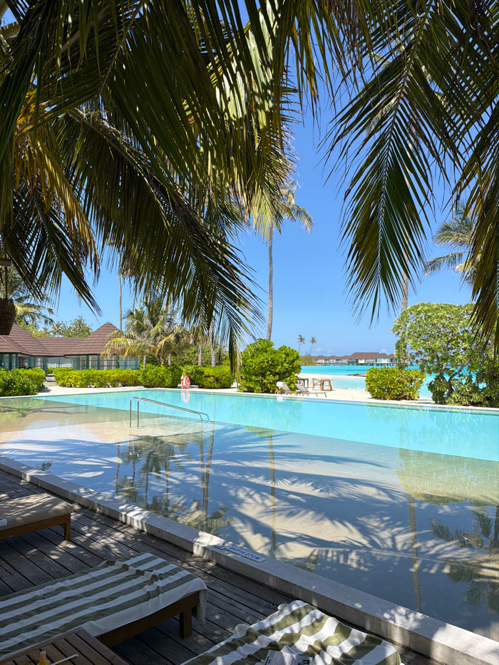 An outdoor scene in Guraidhoo, Maldives, depicts a resort pool area overlooking the ocean under a clear blue sky. The foreground features a wooden deck with two unoccupied wooden lounge chairs, each c…read more