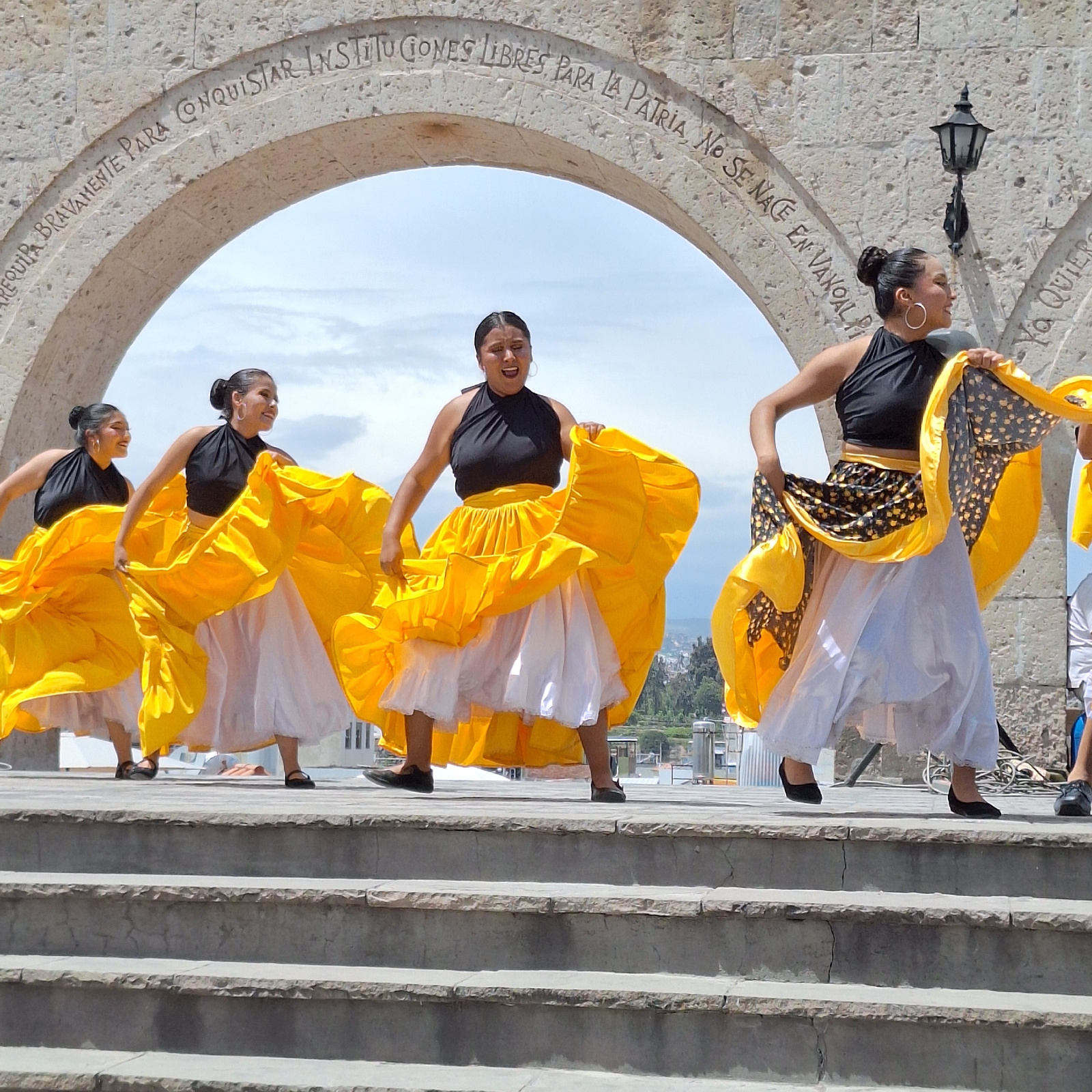 This image captures an outdoor dance performance by four adult females, with a fifth individual partially visible, on a stone platform at the Mirador de Yanahuara in Yanahuara, Arequipa, Peru. The bac…read more