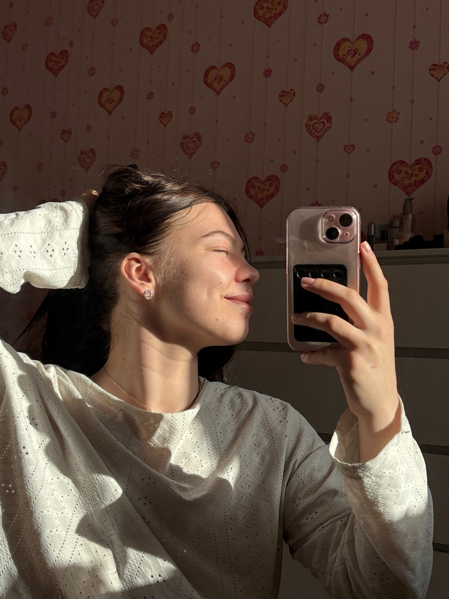 A young woman is lying on her side in Perm, Russia, holding a rose gold iPhone with a black grip on the back above her face. She is wearing a white, lacy blouse and a small earring in her left ear. He…read more