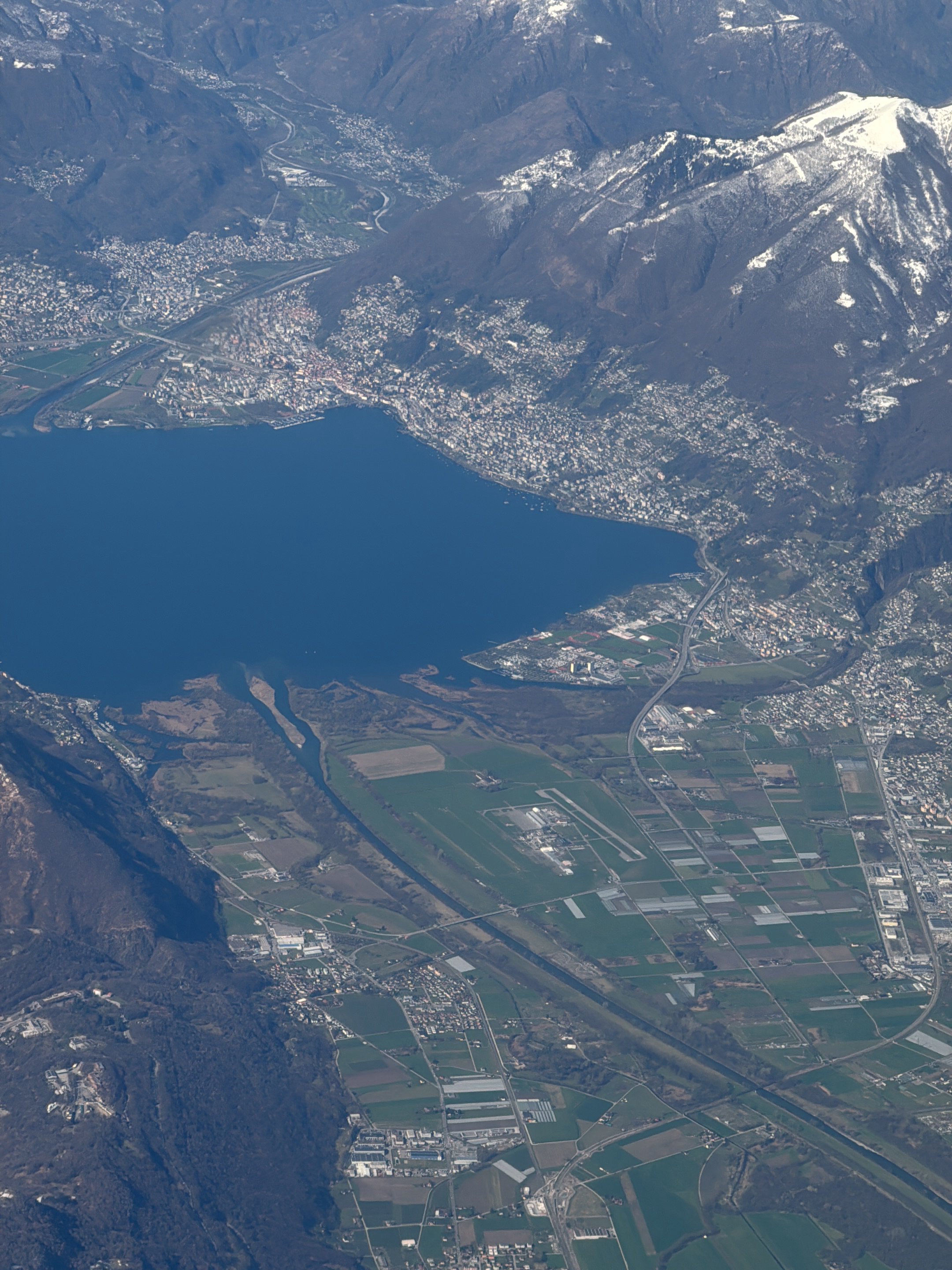 This is an expansive aerial photograph capturing a diverse landscape composed of towering mountains, a large lake, and significant urban and agricultural development. The upper and right portions ofโฆread more