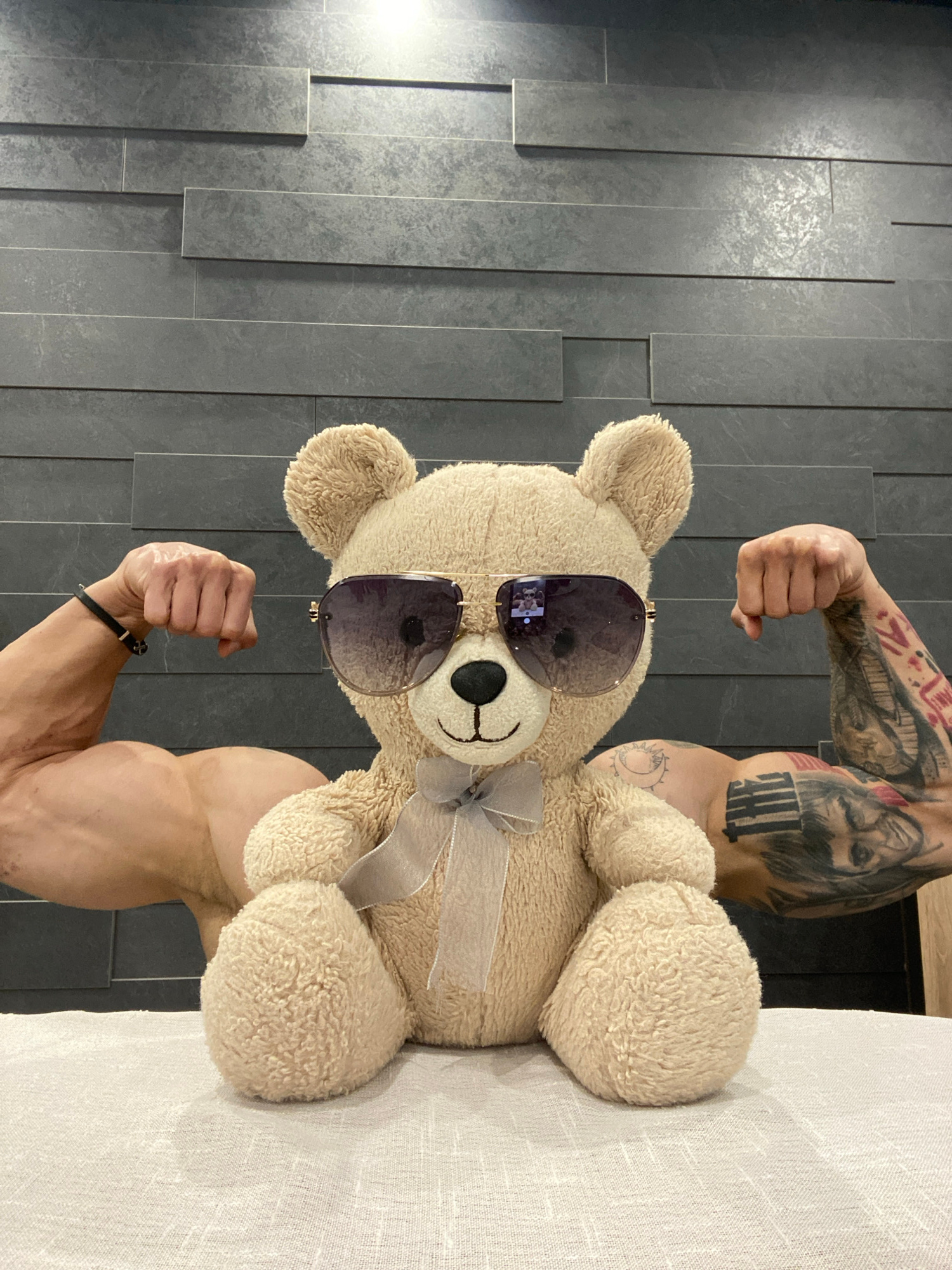 A teddy bear wearing sunglasses is positioned between two muscular arms making fists. The right arm is covered in tattoos. The background includes a textured gray wall on the left and a white textured…read more