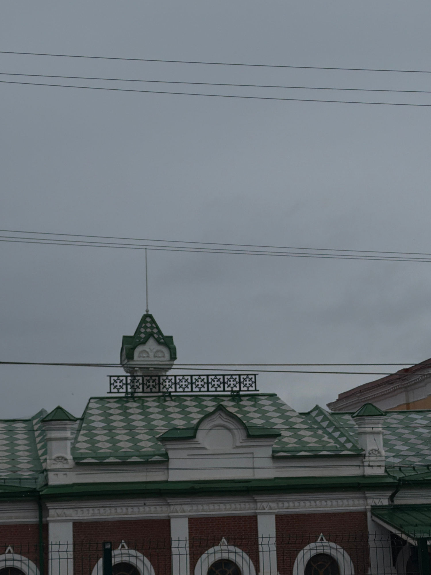 A low-angle shot presents a section of architecture against a grey sky traversed by power lines. The building fragment features white and green diamond-patterned roofing, with architectural embellishm…read more