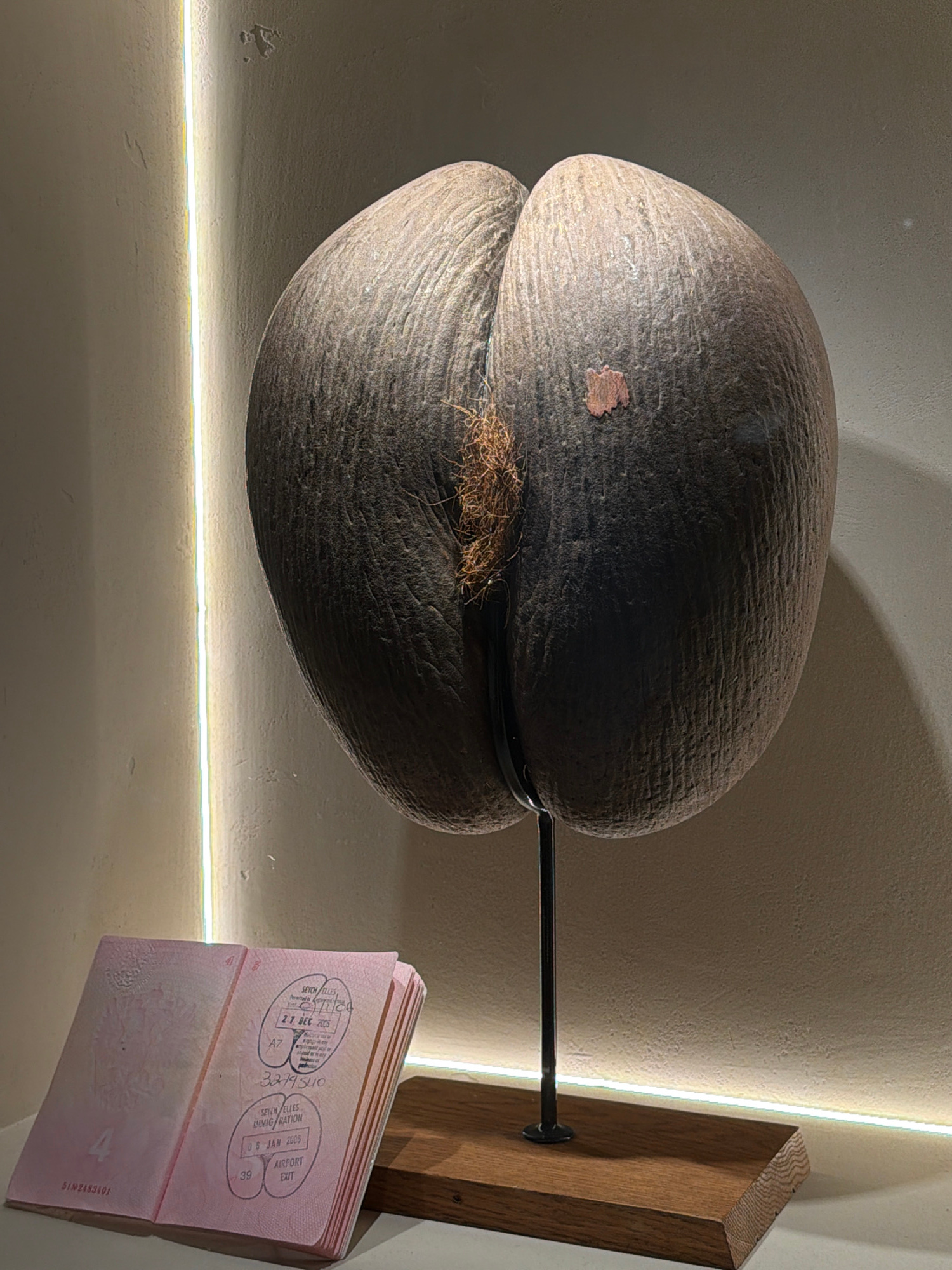 The image shows a mounted Coco de Mer (double coconut) beside an open passport with visible stamps, likely in a museum or display setting in Saint Petersburg, Russia. The Coco de Mer is split and held…read more