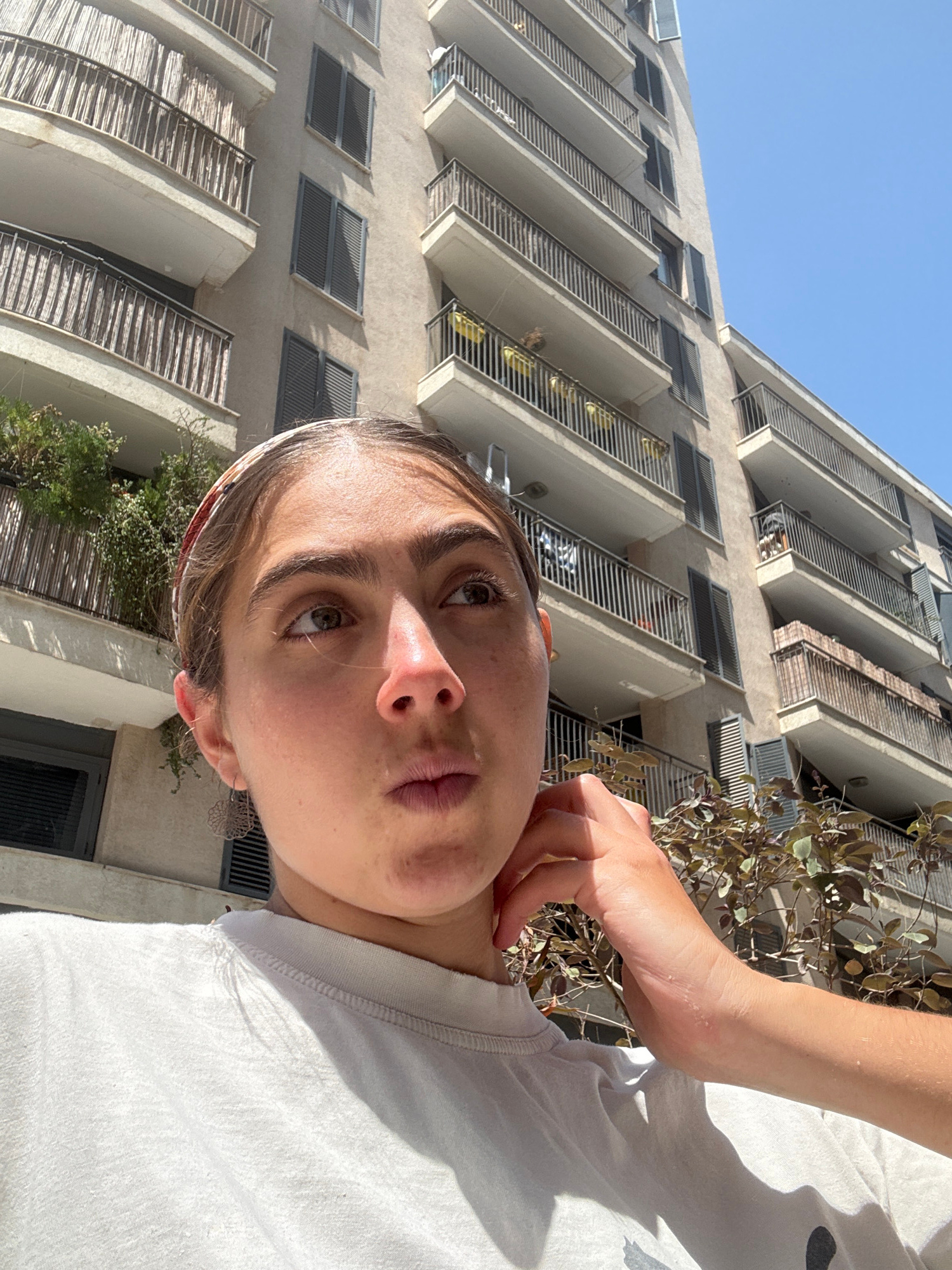 A close-up, angled shot shows a person, likely female, in front of a tall apartment building. The person has fair skin, light brown hair with a patterned headband, and appears to be wearing a white t-…read more