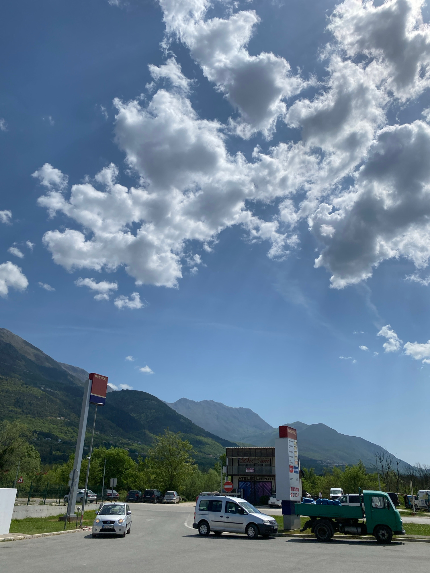 This image captures a bright, sunny daytime scene in Kavač, Montenegro, featuring a blend of natural mountainous landscape and a commercial roadside area. The sky is a prominent feature, displaying a…read more