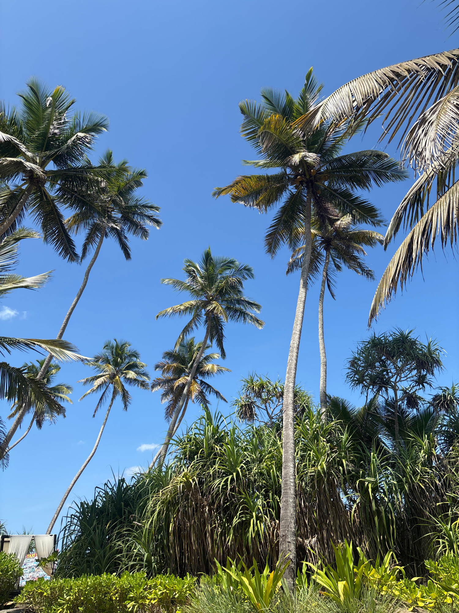 The image displays an upward view of a vibrant tropical scene under a clear blue sky, likely taken on a sunny day. The perspective is looking up through the canopy of several tall palm trees and dense…read more