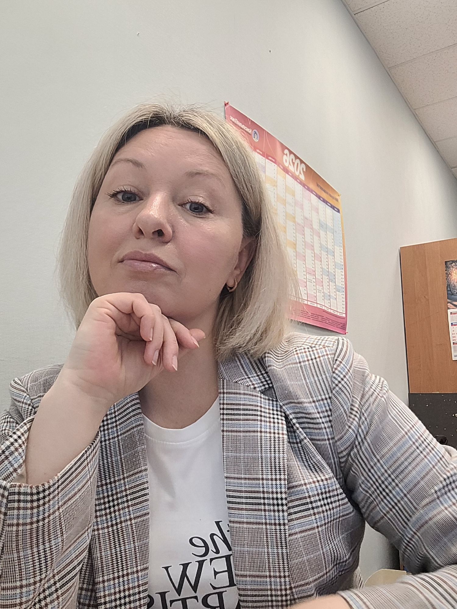 A woman with short blonde hair and blue eyes is posing for a selfie. She is wearing a white t-shirt with black lettering and a plaid blazer. Her hand is resting under her chin in a thoughtful gesture. Behind her, there is a wall with a calendar displaying the year "2023" visible. There is also what appears to be a wooden cabinet above the calendar. The location cannot be determined based on the visual information provided. There is no indication of the city of Izhevsk, Russia in this image. | Open Wire