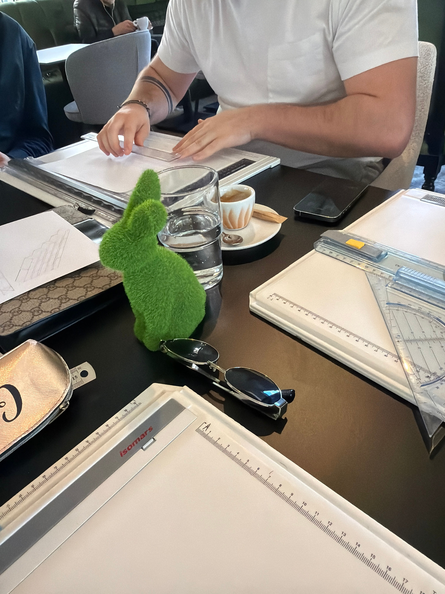 An individual wearing a white shirt and dark pants is seated at a dark-colored table. The table contains drawing instruments including two Isomars drawing boards, a drafting machine, paper, a clear gl…read more