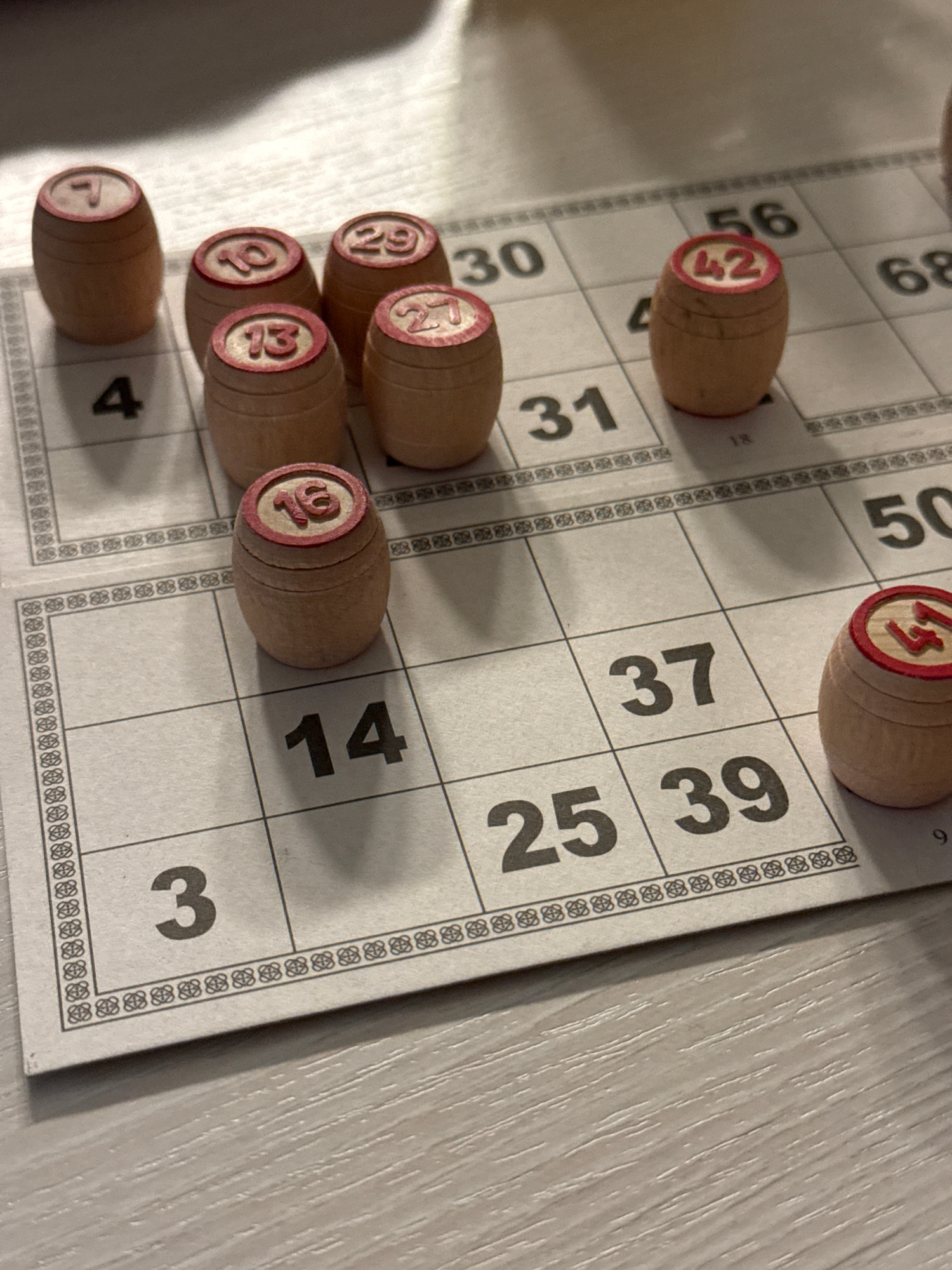 A close-up shot depicts a bingo game in progress. The game board is visible, with numbers ranging from 3 to 68. Several wooden barrels with numbers printed on them are placed on the board, marking the…read more