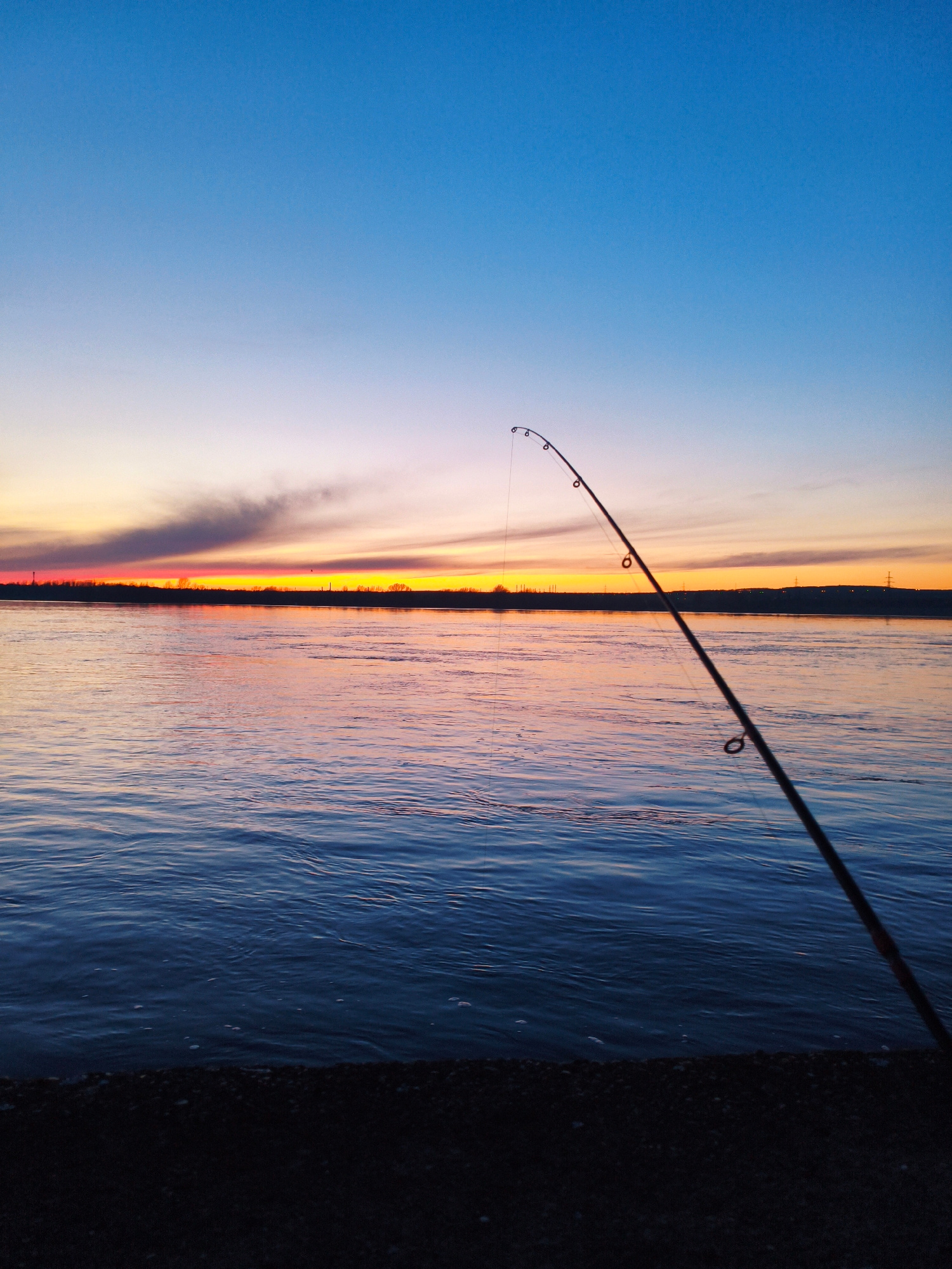The image depicts a fishing scene at sunset in or near Chaikovsky, Russia. A fishing rod is prominently positioned in the foreground, extending from the bottom right towards the upper center of the fr…read more