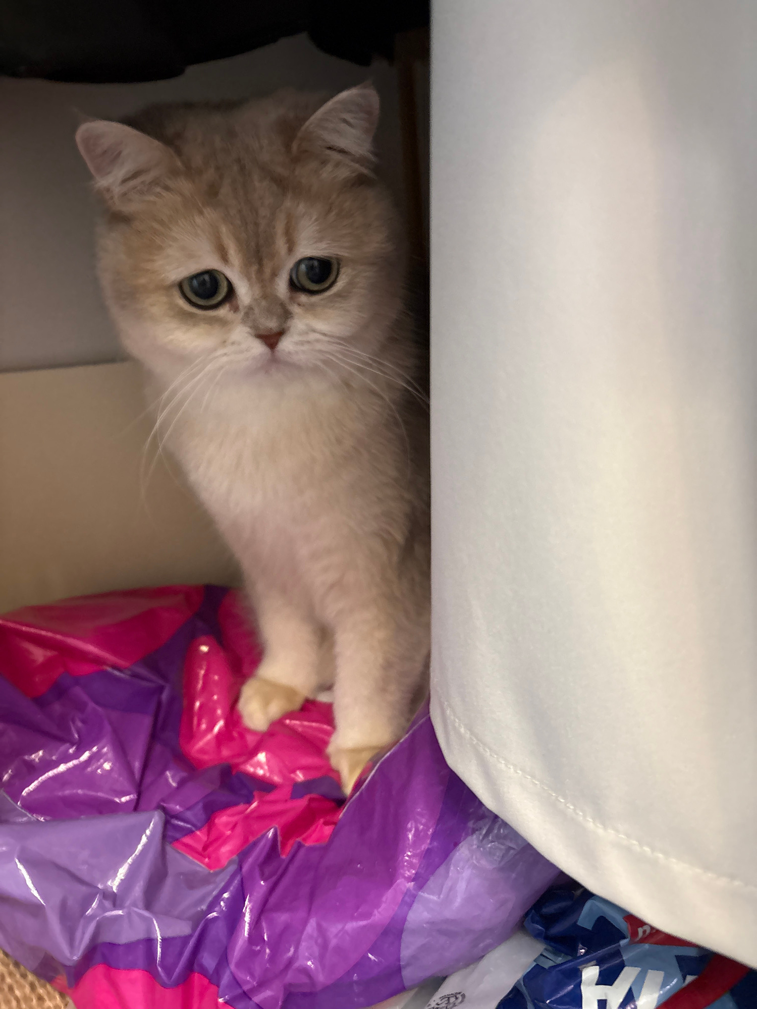 A light-colored cat with prominent blue-green eyes is captured in an indoor setting, looking directly up at the viewer. The cat, appearing to be a young domestic breed with fluffy, cream-colored fur,…read more