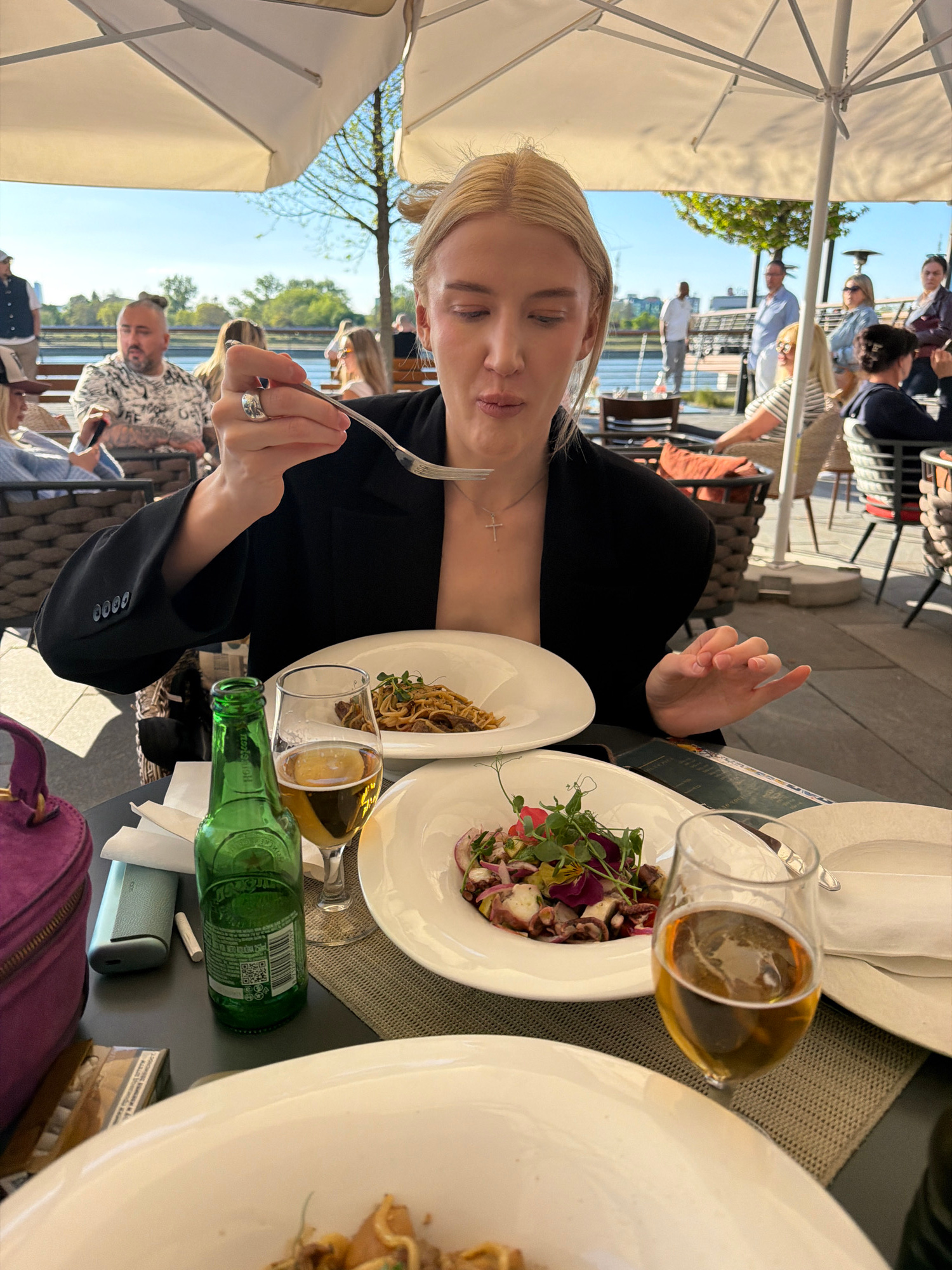 A woman with blonde hair is sitting at an outdoor table, eating and looking at the camera. She is holding a fork in her right hand. The table is set with several plates of food, including a salad with…read more