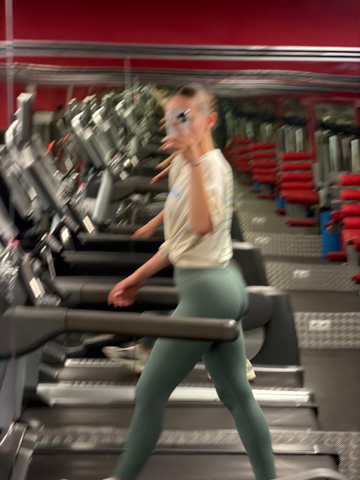 The image, captured with significant motion blur, depicts an indoor scene in what appears to be a gym or fitness center. A young person, likely female, is visible on a treadmill. She is wearing a ligh…read more