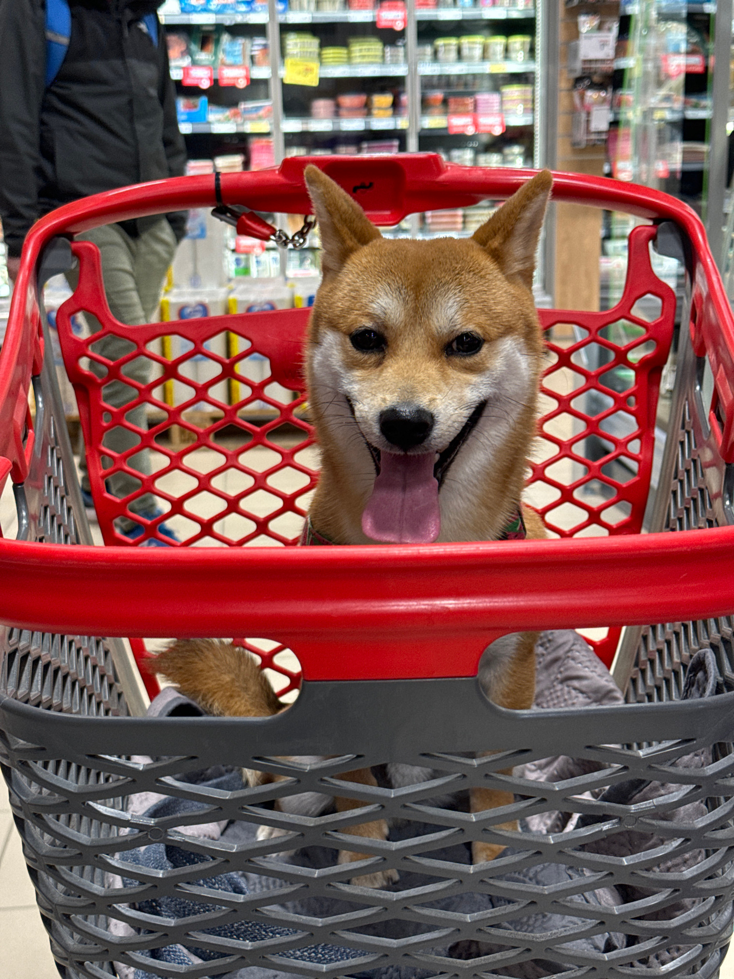 A Shiba Inu dog sits in the top basket of a red and gray shopping cart. The dog faces the viewer with its tongue hanging out. The cart is in a store with aisles visible in the background. One person,…read more