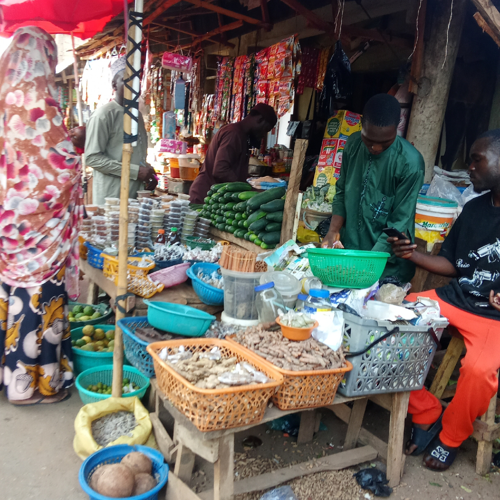 The image captures a bustling market scene in Akwanga, Nigeria. A woman in a patterned headscarf and dress stands near a vendor with rows of goods. Baskets brimming with turmeric, limes, coconuts, and…read more