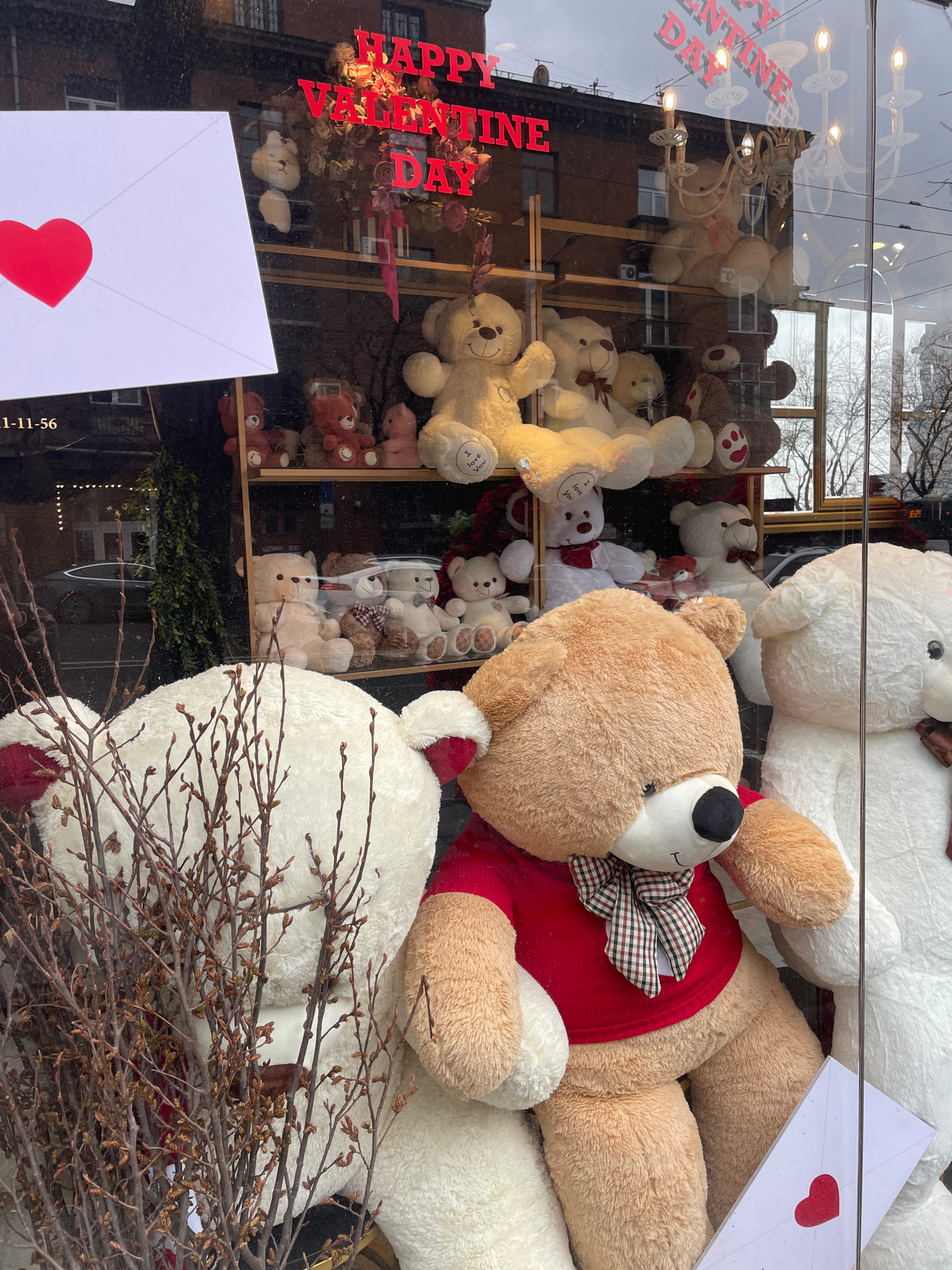 This image displays a retail storefront window in Yerevan, Armenia, featuring a Valentine's Day promotional arrangement. Numerous plush teddy bears of assorted sizes and colors are positioned througho…read more