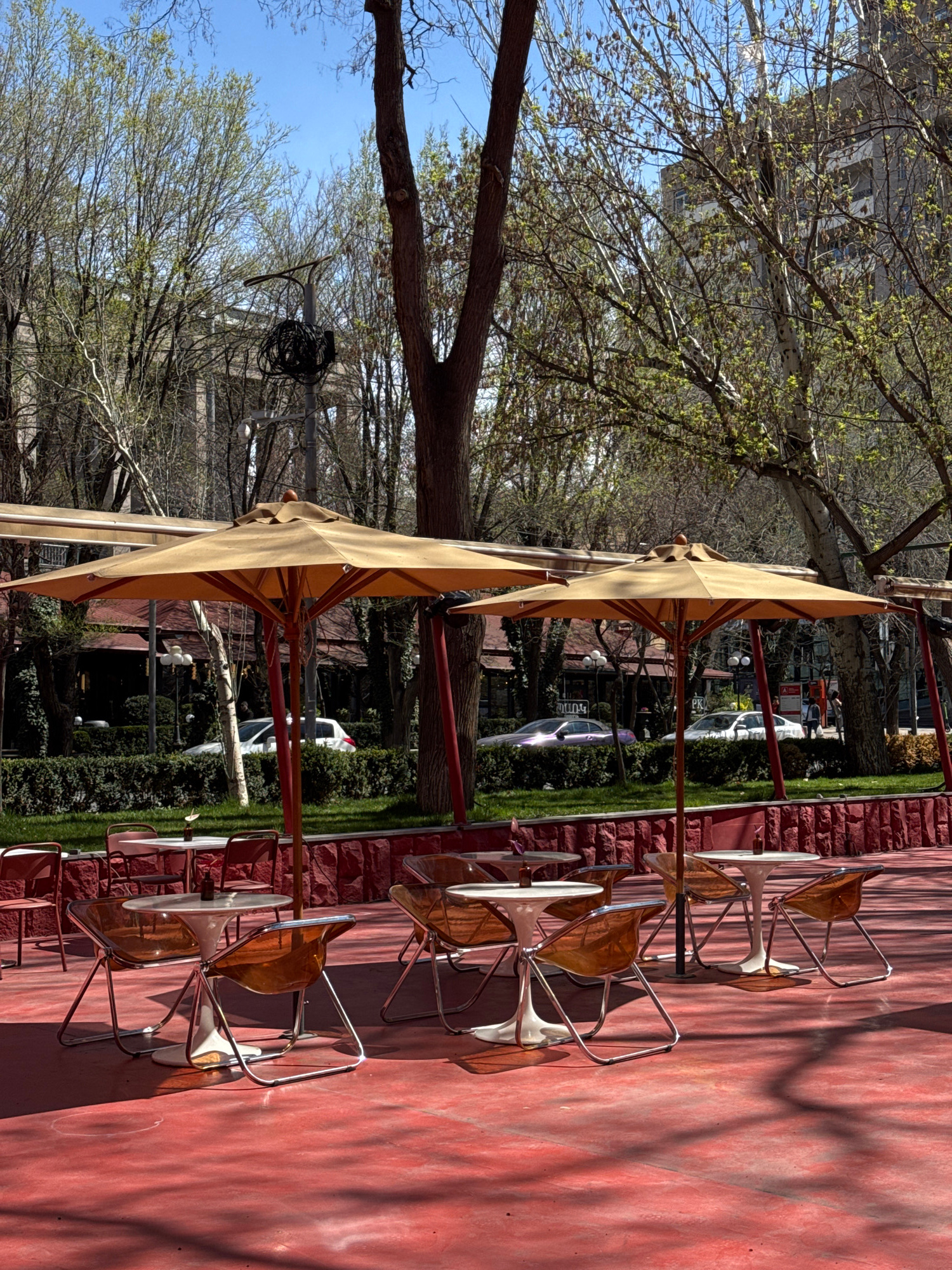 The image depicts an outdoor seating area of a cafe in Yerevan, Armenia. The setting features a bright red, textured concrete surface. Rows of metal-framed tables with cream-colored tops and transpare…read more