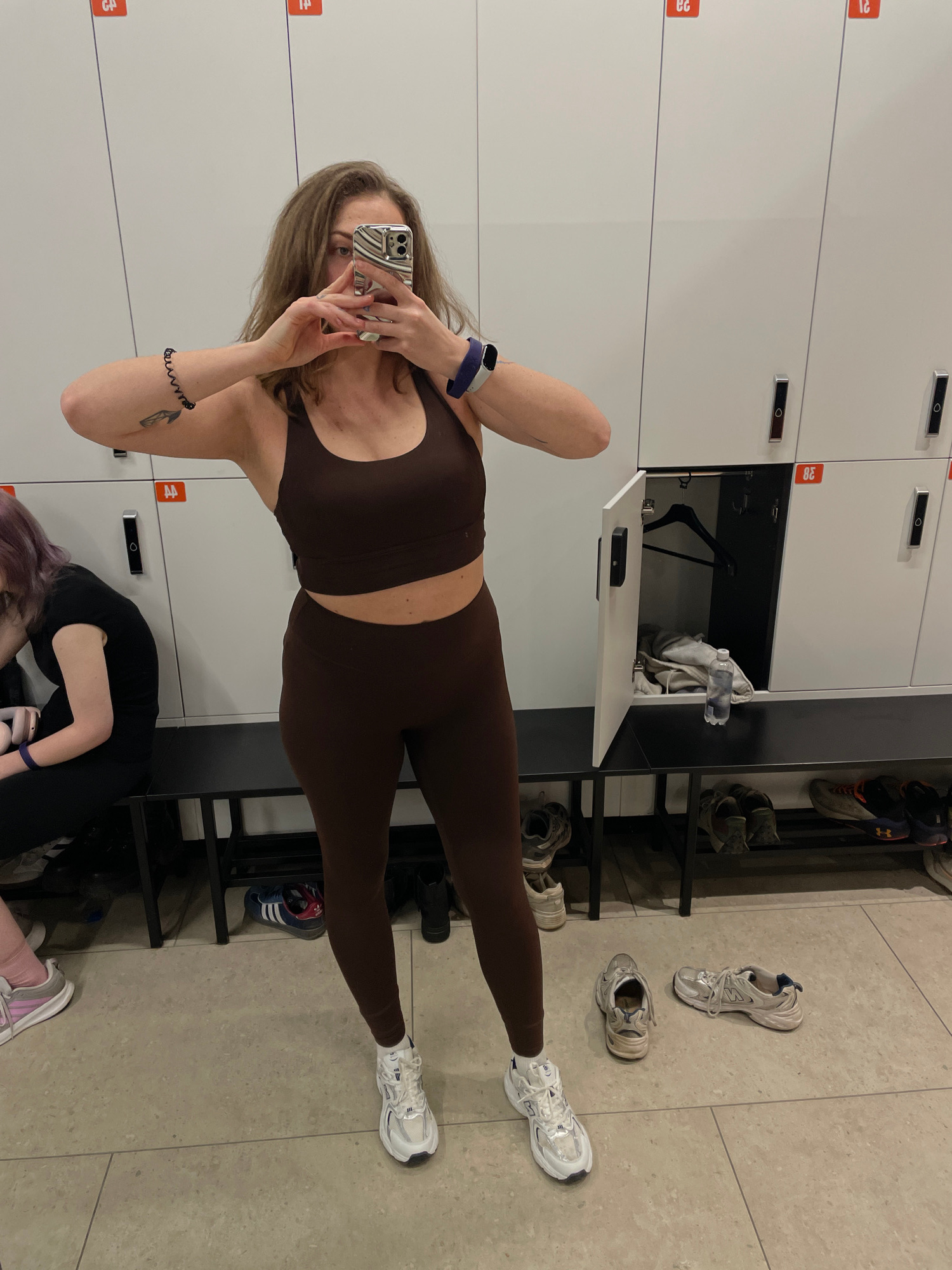A woman in a brown sports bra and leggings is taking a selfie in front of a bank of white lockers with orange numbers. The lockers appear to be in a gym or changing room, with a shoe rack containing vā¦read more