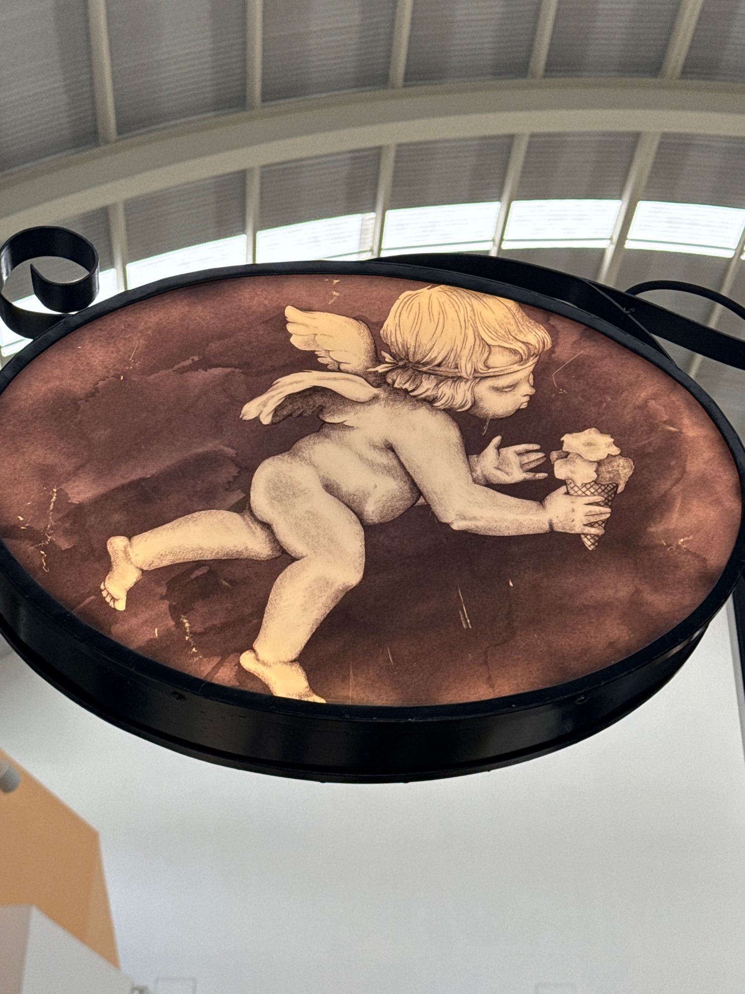 A sign with a stylized angel holding an ice cream cone is the central focus. The angel is drawn in light colors against a brown, mottled background. The sign is oval and encased in a black metal frame…read more