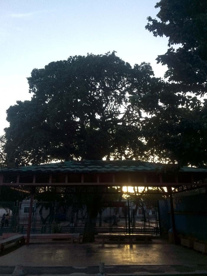 An open structure with a corrugated roof sits beneath the silhouette of large trees. Sunlight streams through the structure's openings. The ground inside the structure reflects the light, creating a b…read more