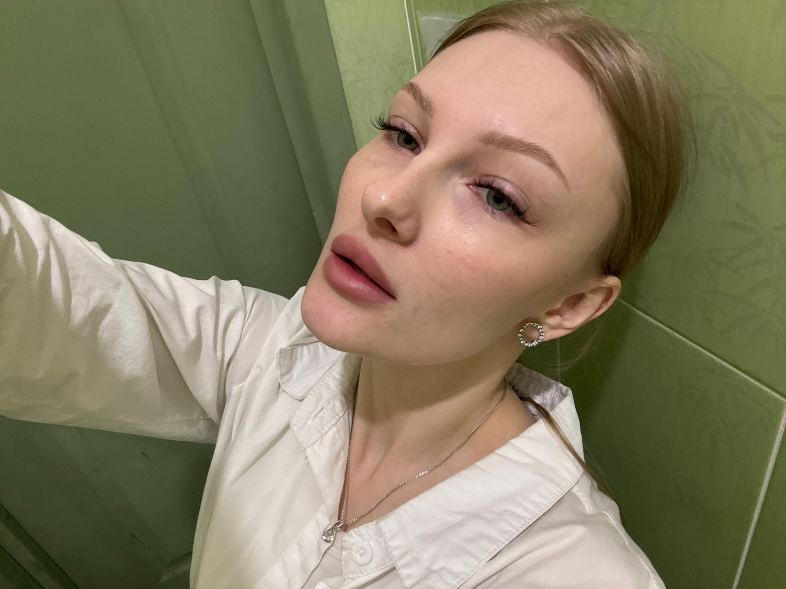 A close-up, slightly downward-angled shot features a woman with light skin and blonde hair partially visible in the lower left corner. She has green eyes, defined eyebrows, and plump lips. She wears a…read more