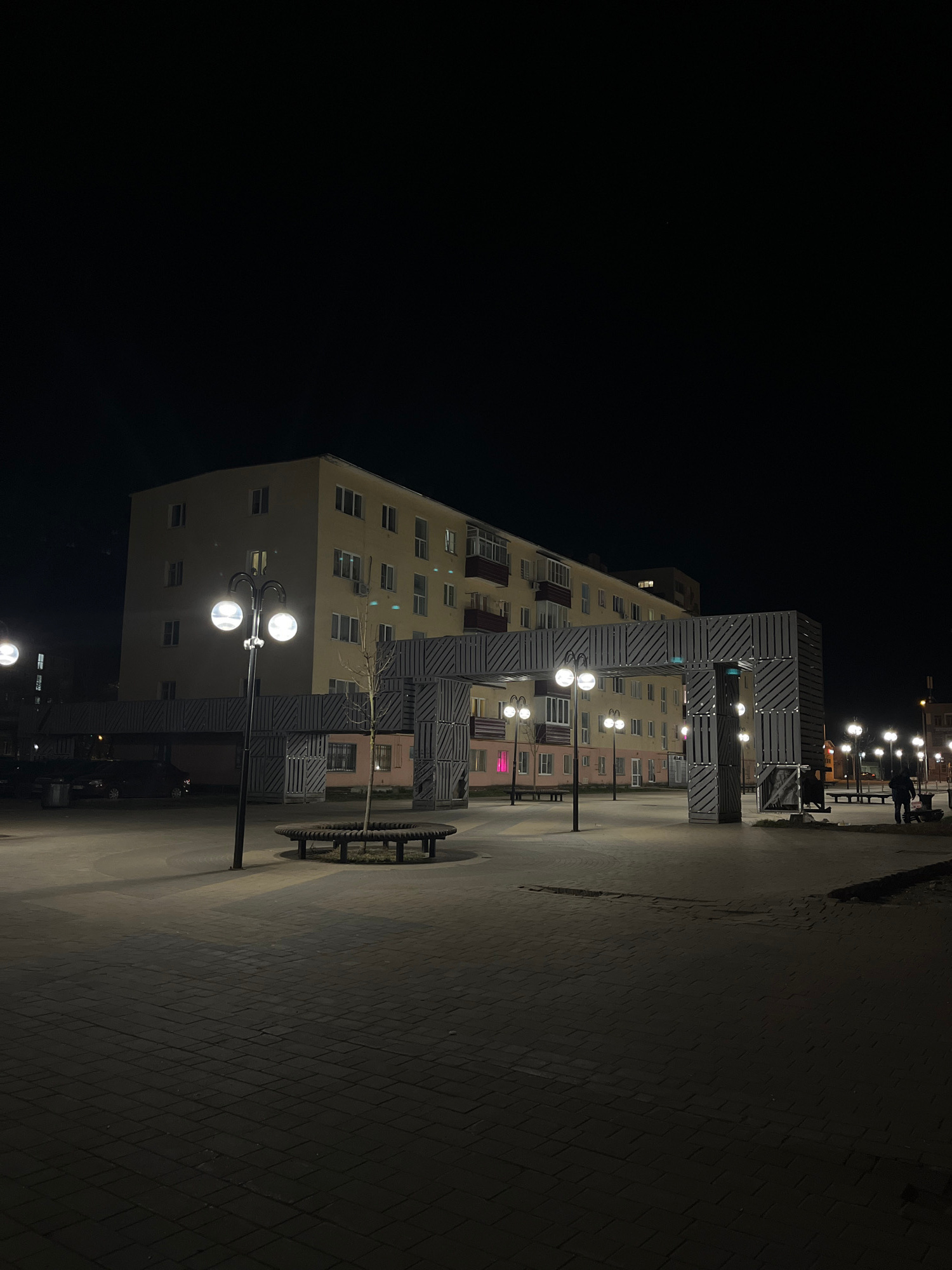 At night in Klin, Russia, a five-story building stands illuminated by street lights. The building is beige with many windows. The façade is decorated with gray, geometric accents. A pathway, lit by gl…read more