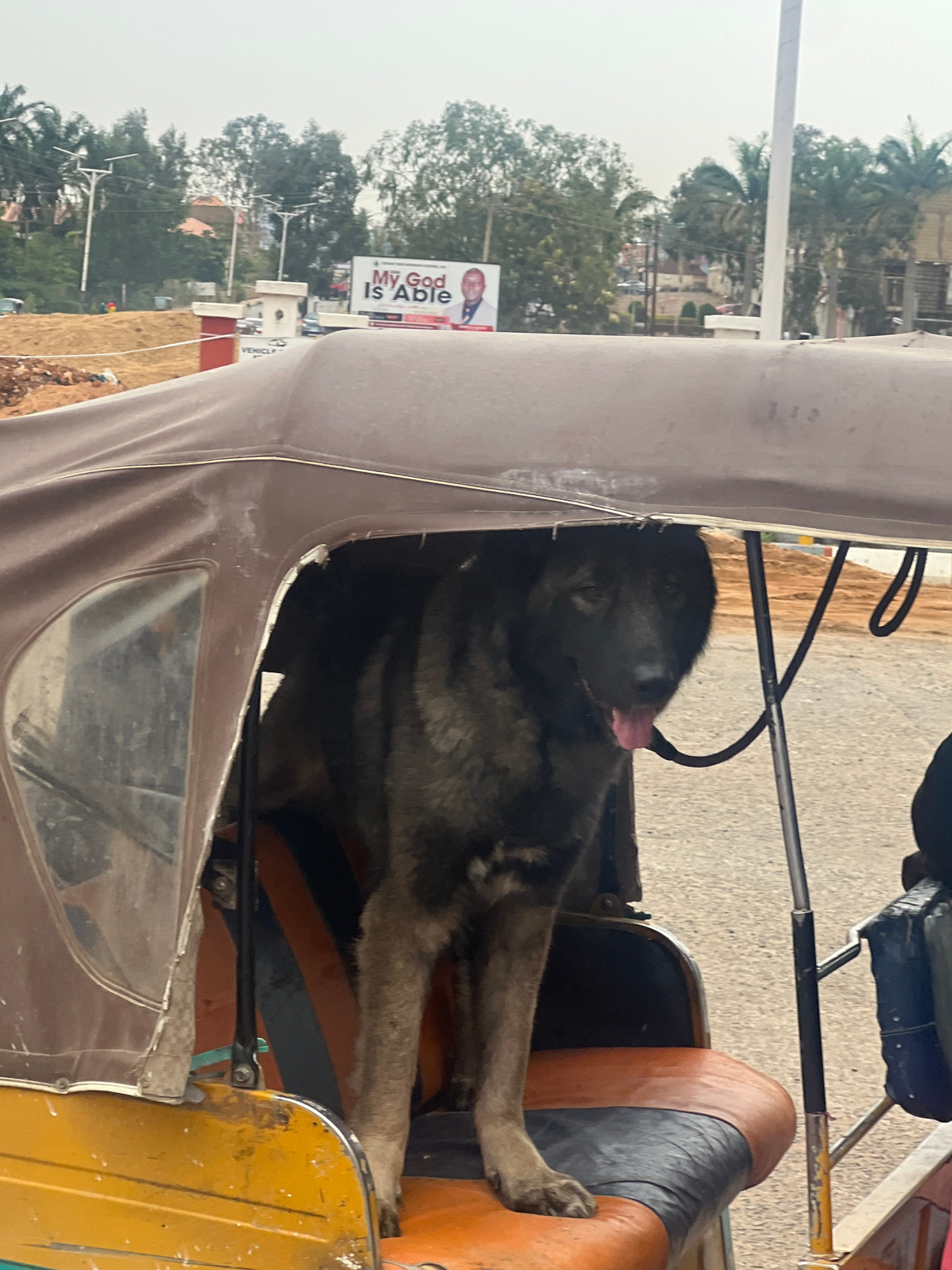 A large, dark-colored dog is inside a yellow and orange auto-rickshaw (tuk-tuk). The dog is panting, with its tongue visible. The rickshaw has a brown canvas cover with a cloudy, rectangular plastic w…read more