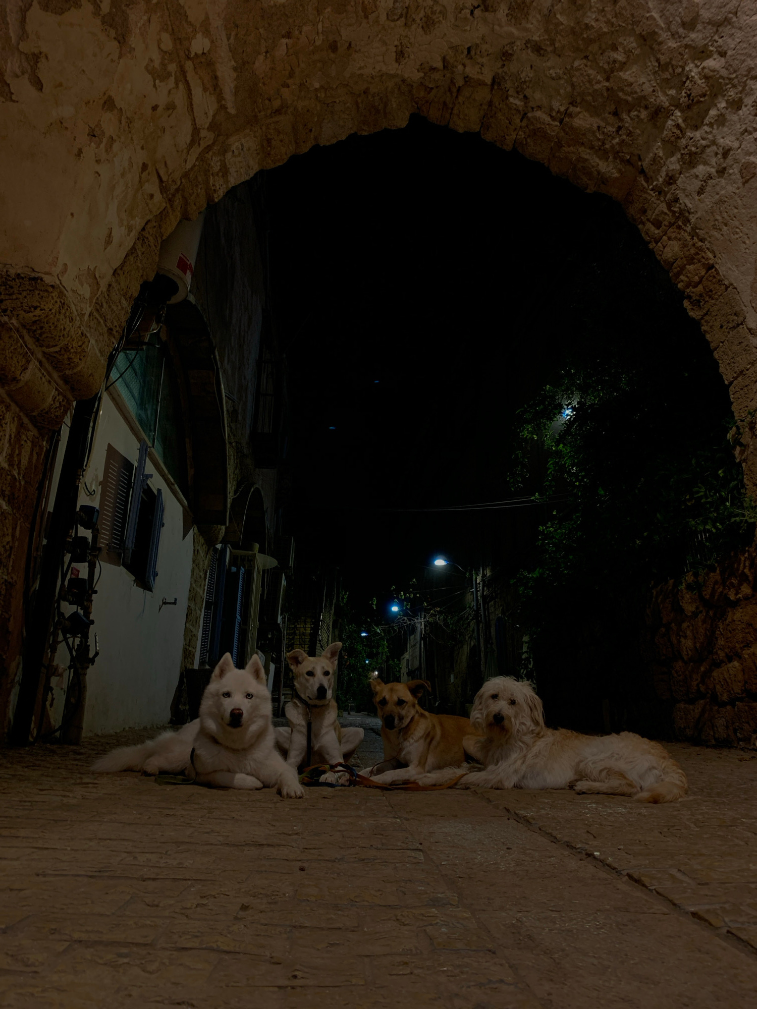 The scene is an outdoor shot at night, likely in Tel-Aviv, Israel. The image is taken from within an archway constructed from weathered stone. Outside the archway, the scene opens to a narrow street l…read more